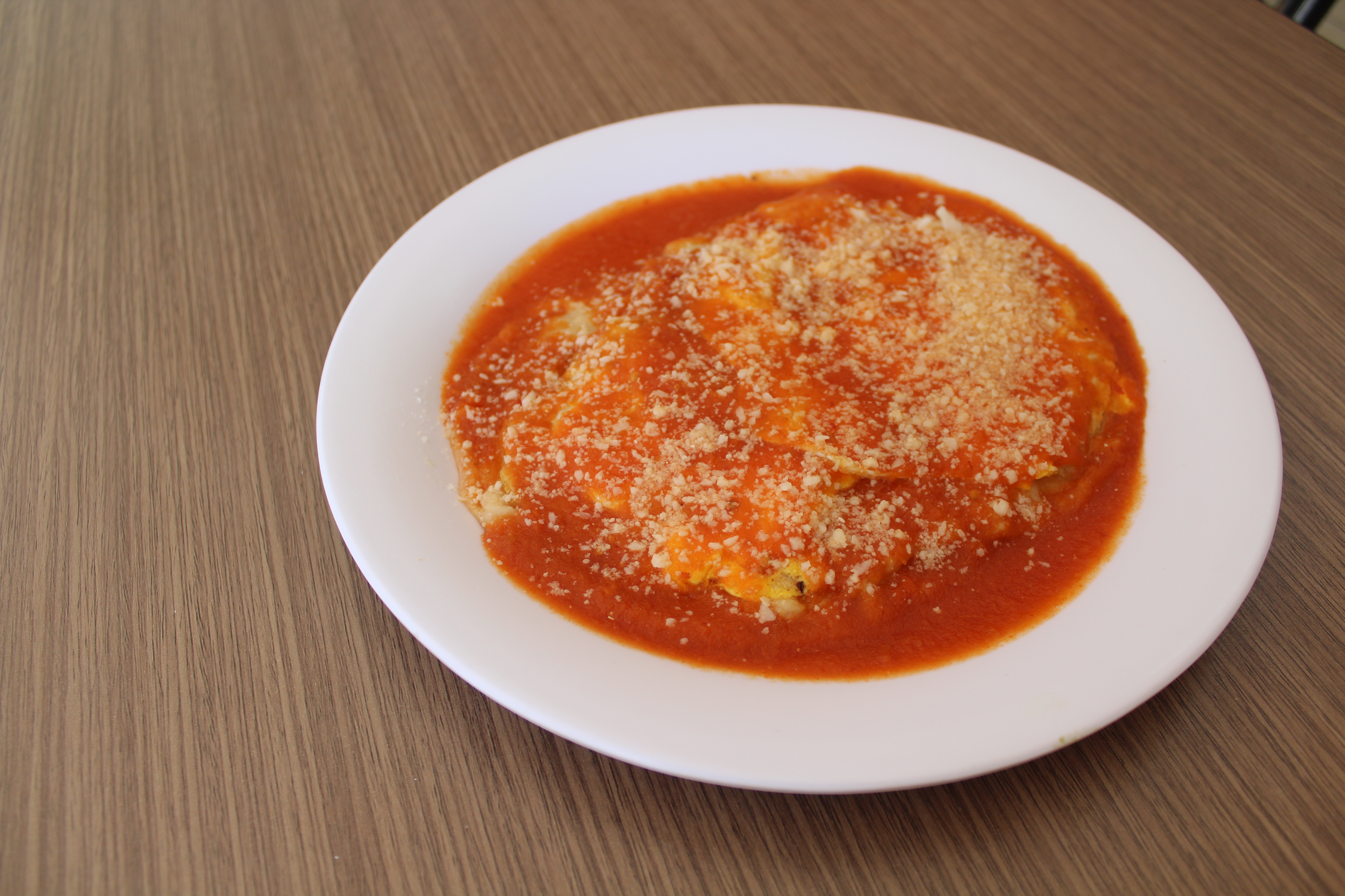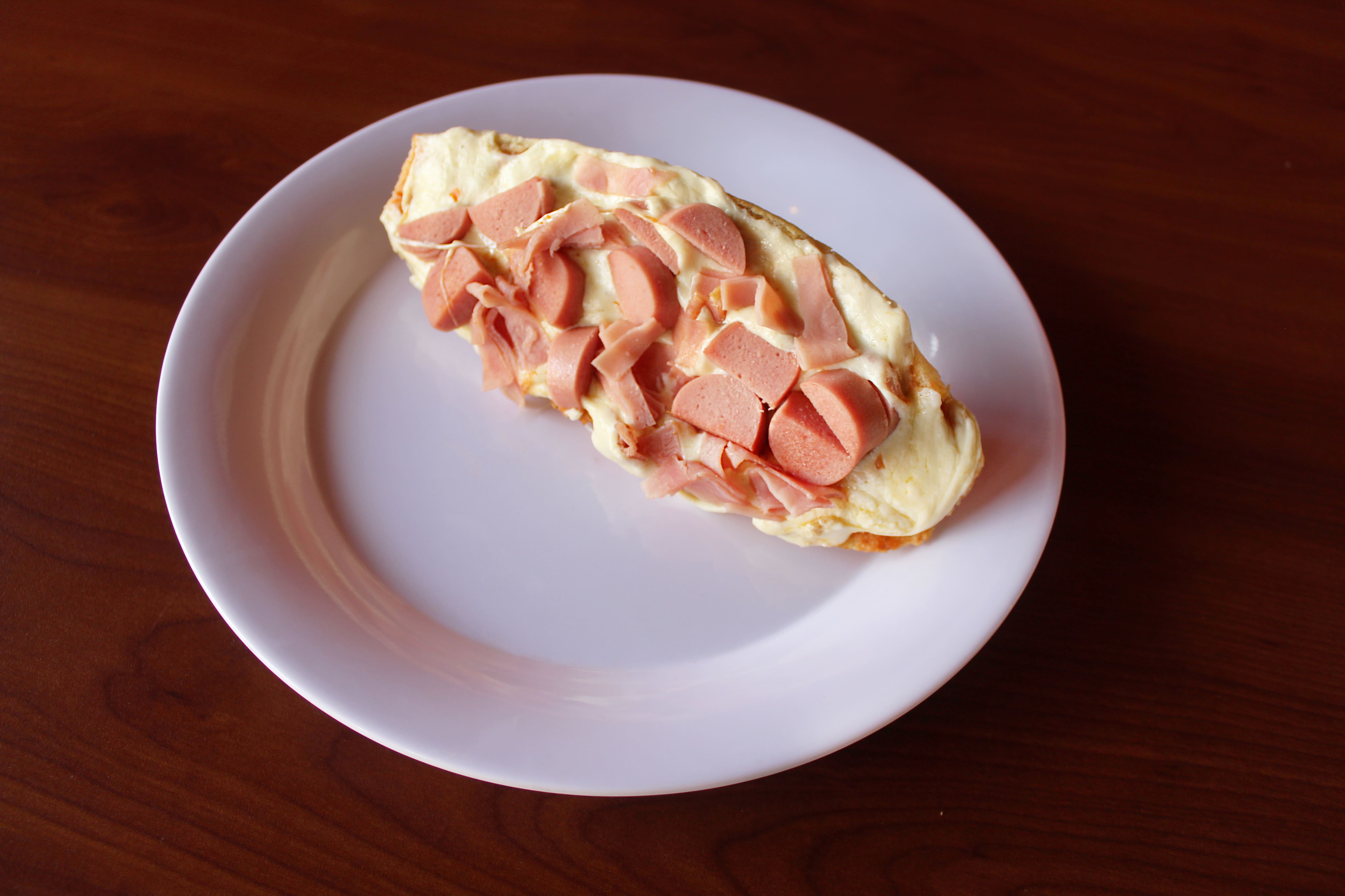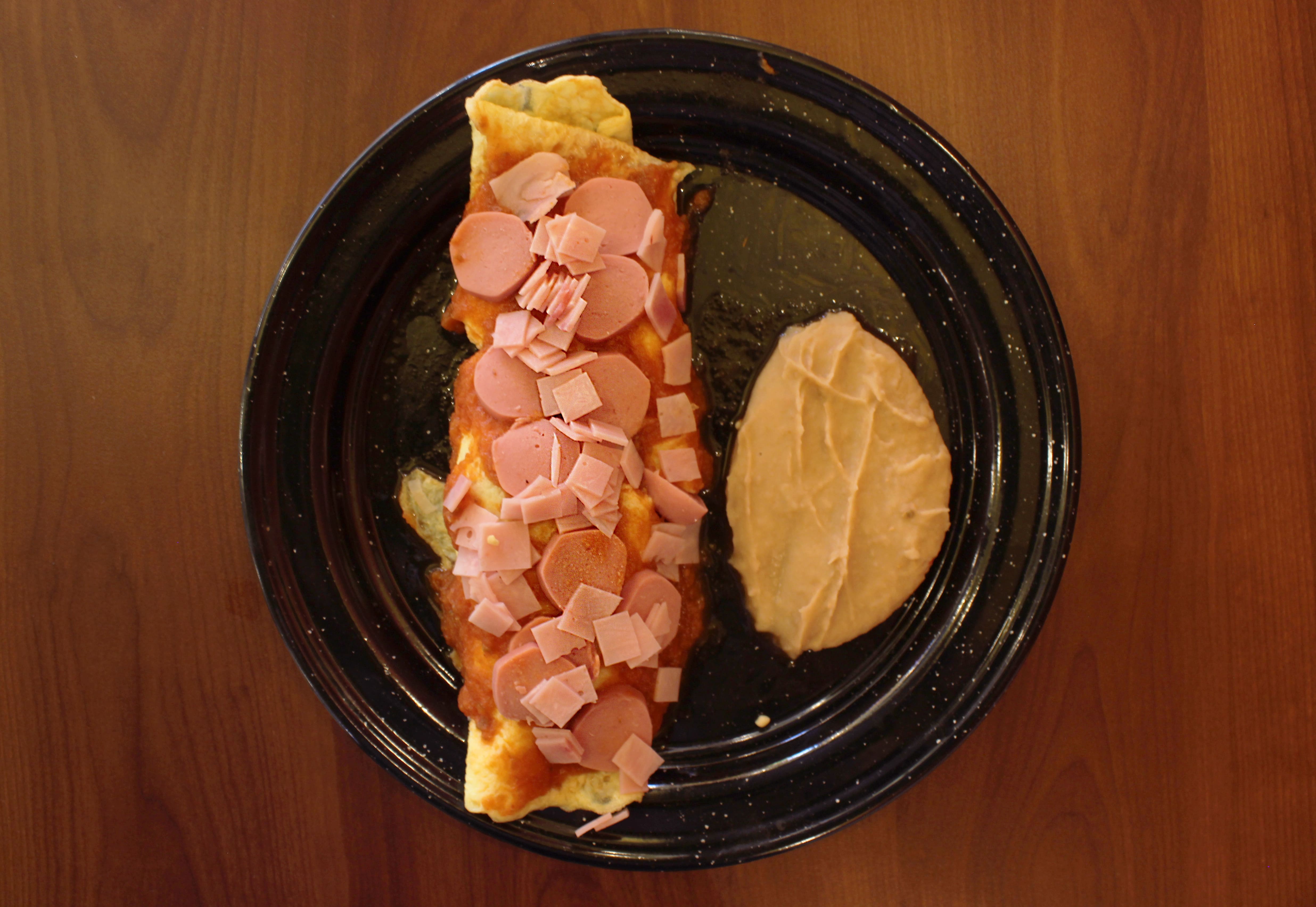 Omelette relleno de jamón y salchicha, con un espejo de salsa roja, frijol y birote.