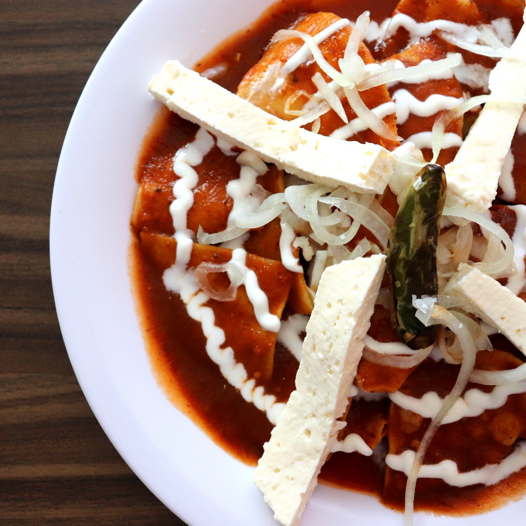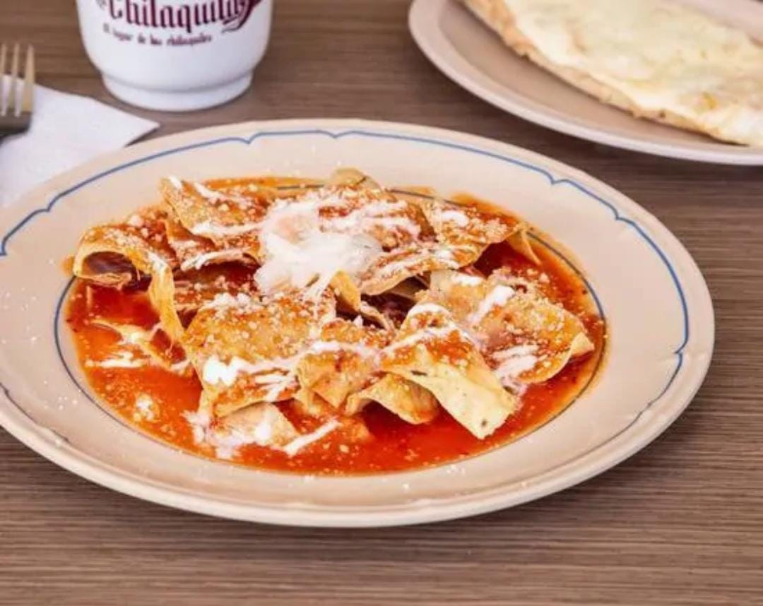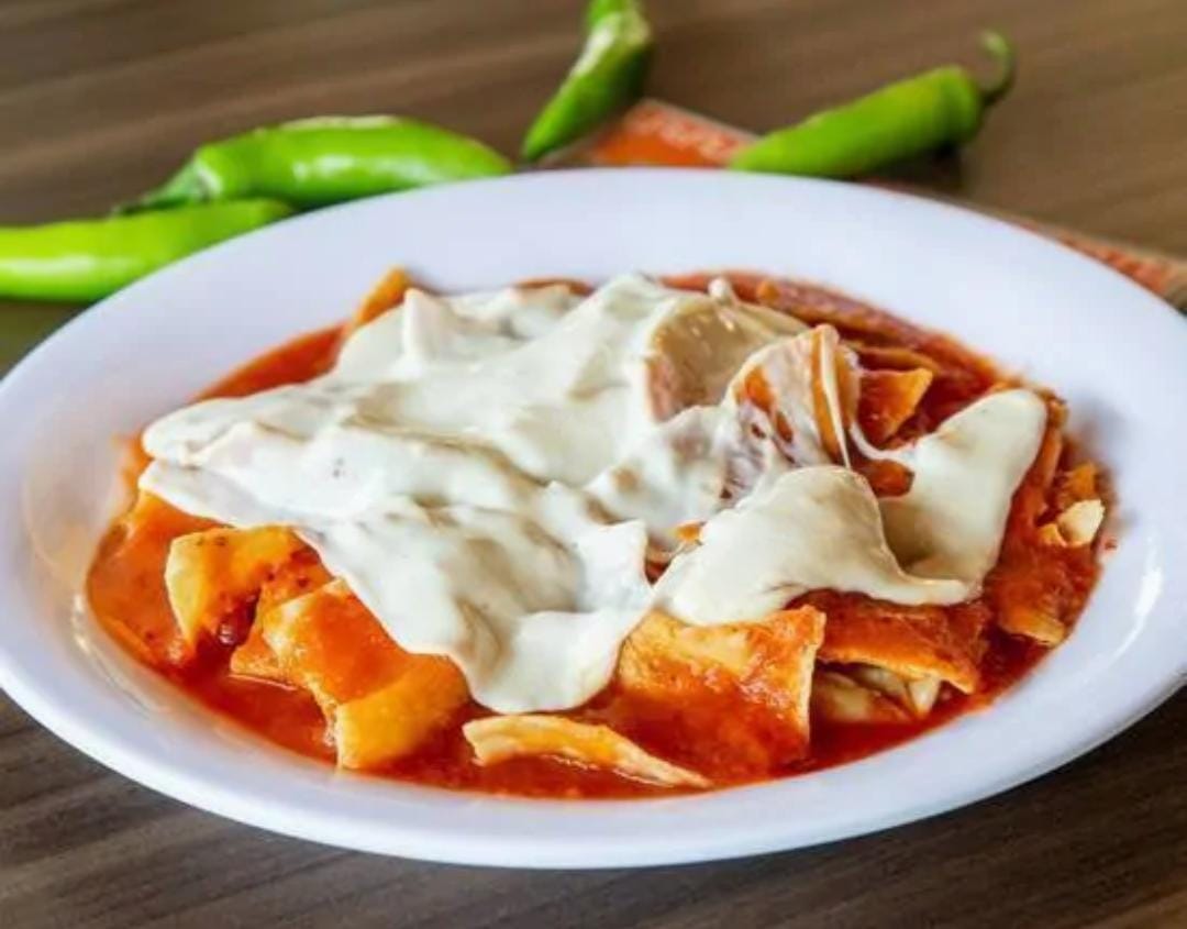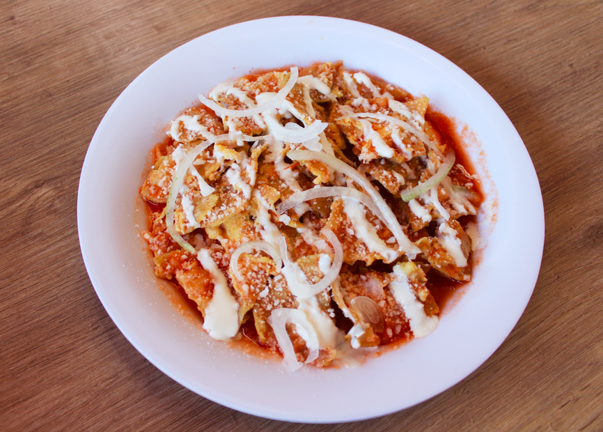 Chilaquiles rojos o verdes con totopo dorado, cubierta de queso gratinado, cebolla, queso, crema, frijol y birote.