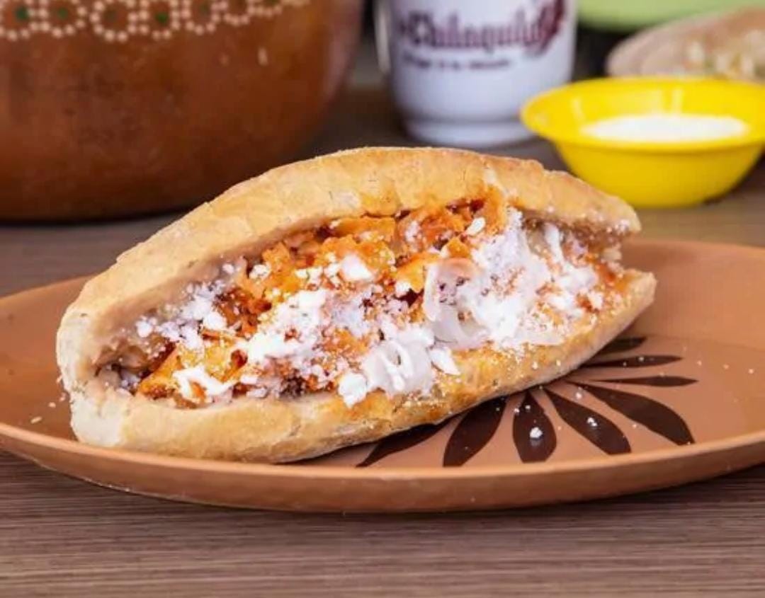 Lonche de chilaquiles rojos o verdes, con queso, crema y cebolla.