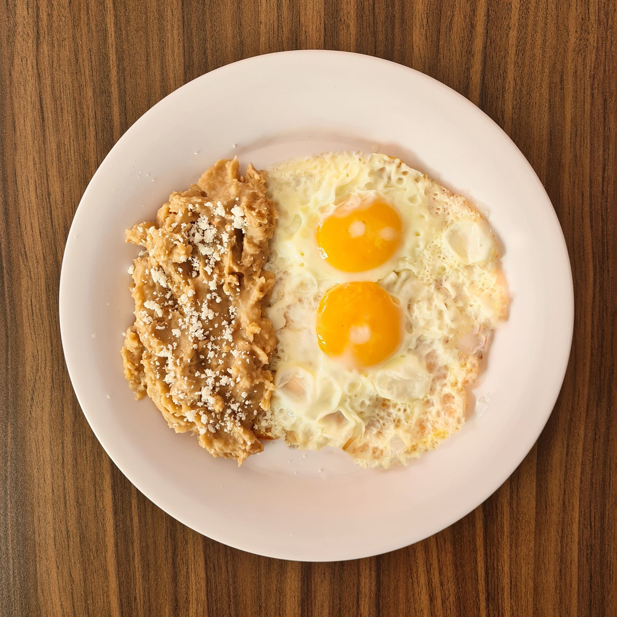 2 Huevos estrellados o revueltos con frijol y medio birote.