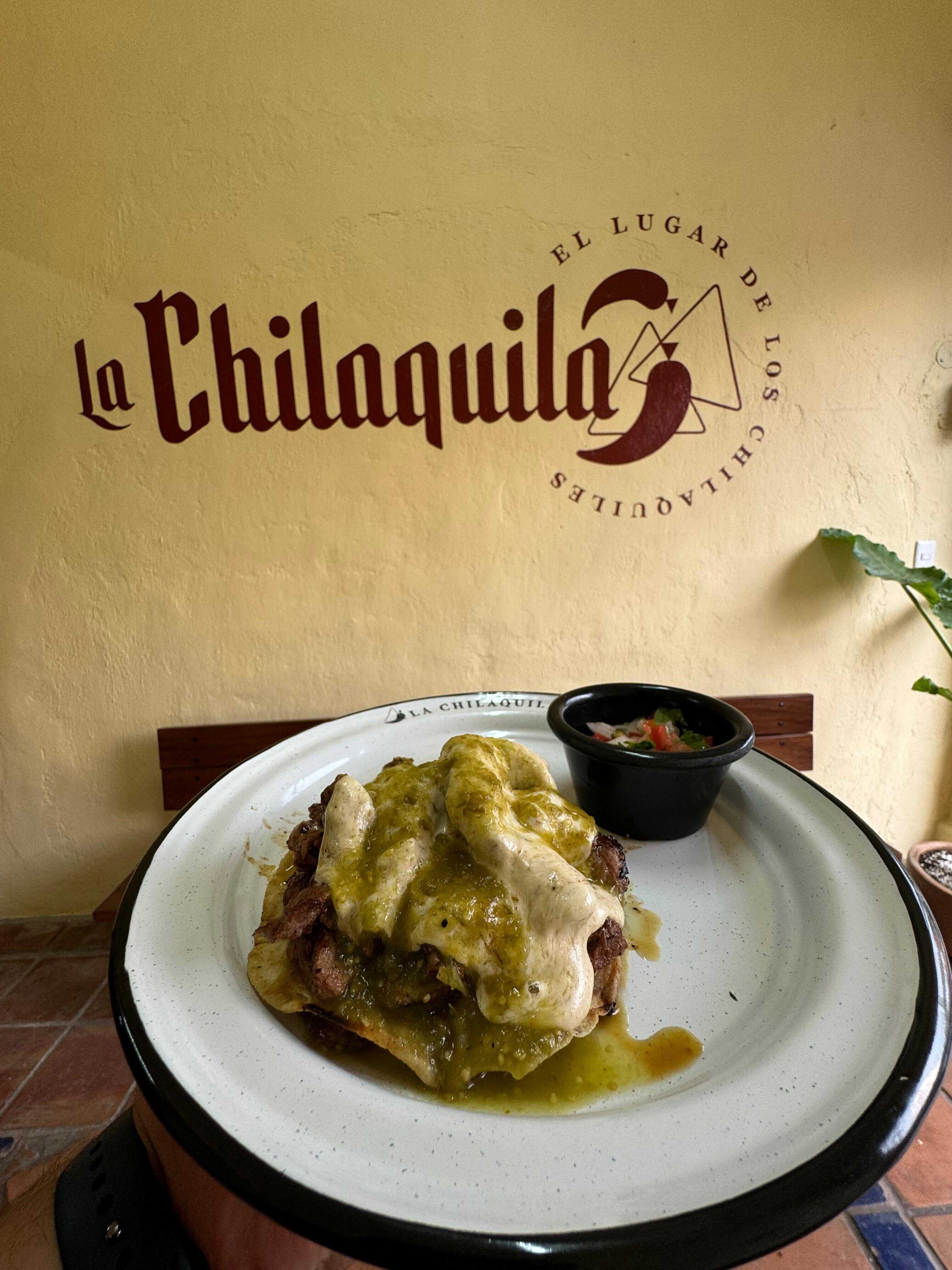 Chilaquiles con totopo dorado, salsa chipotle chilaquila, panela, chile toreado, cebolla, queso, crema, frijol y birote.