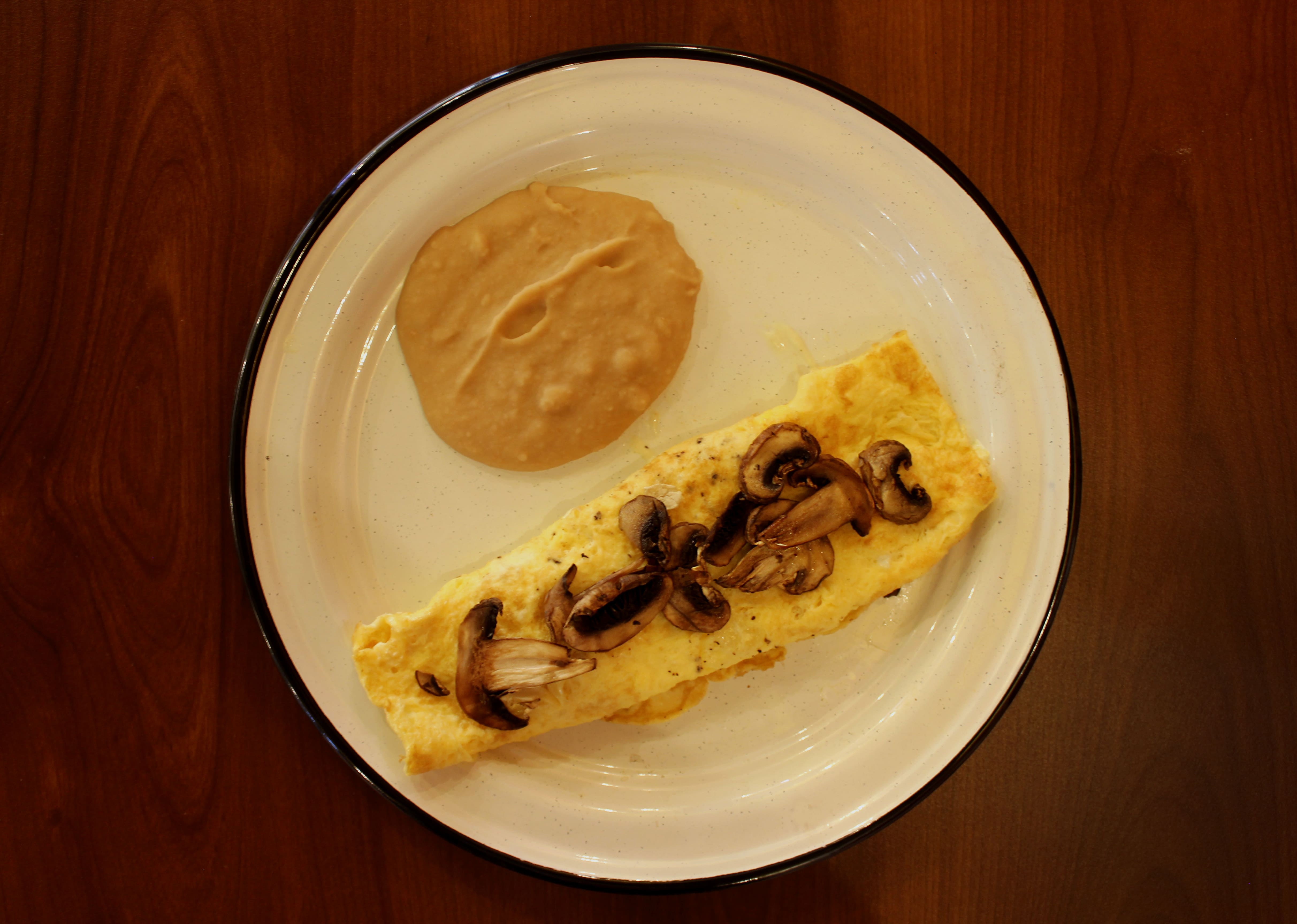 Omelette relleno de champiñones y cebolla guisada, frijol y birote.