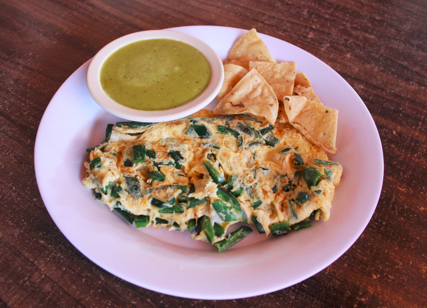 Omelette relleno de chilaquiles rojos o verdes, frijol y birote.