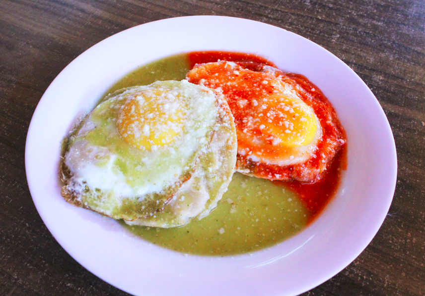 2 Huevos estrellados montados sobre tortilla dorada, bañados en frijoles y salsa roja, queso y medio birote.