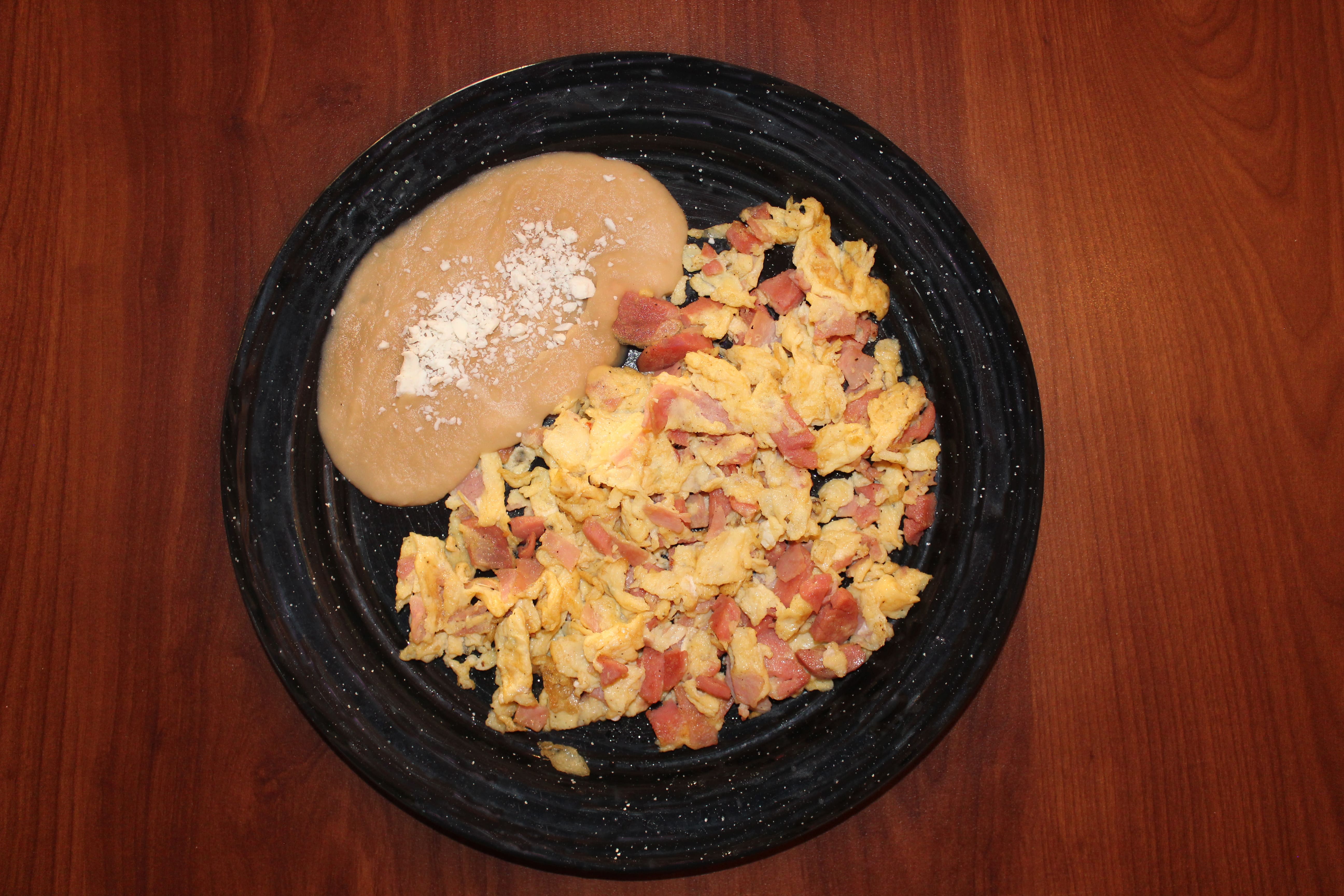 2 Huevos revueltos con jamón, salchicha, frijol y medio birote.