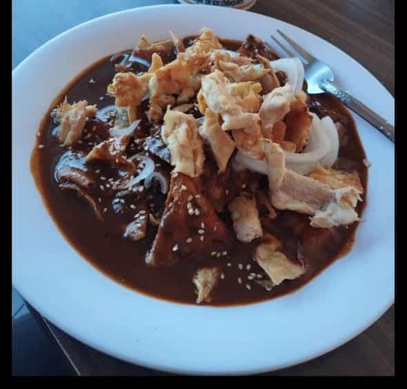 Chilaquiles con totopo dorado, bañados en mole, cebolla, queso, frijol y birote