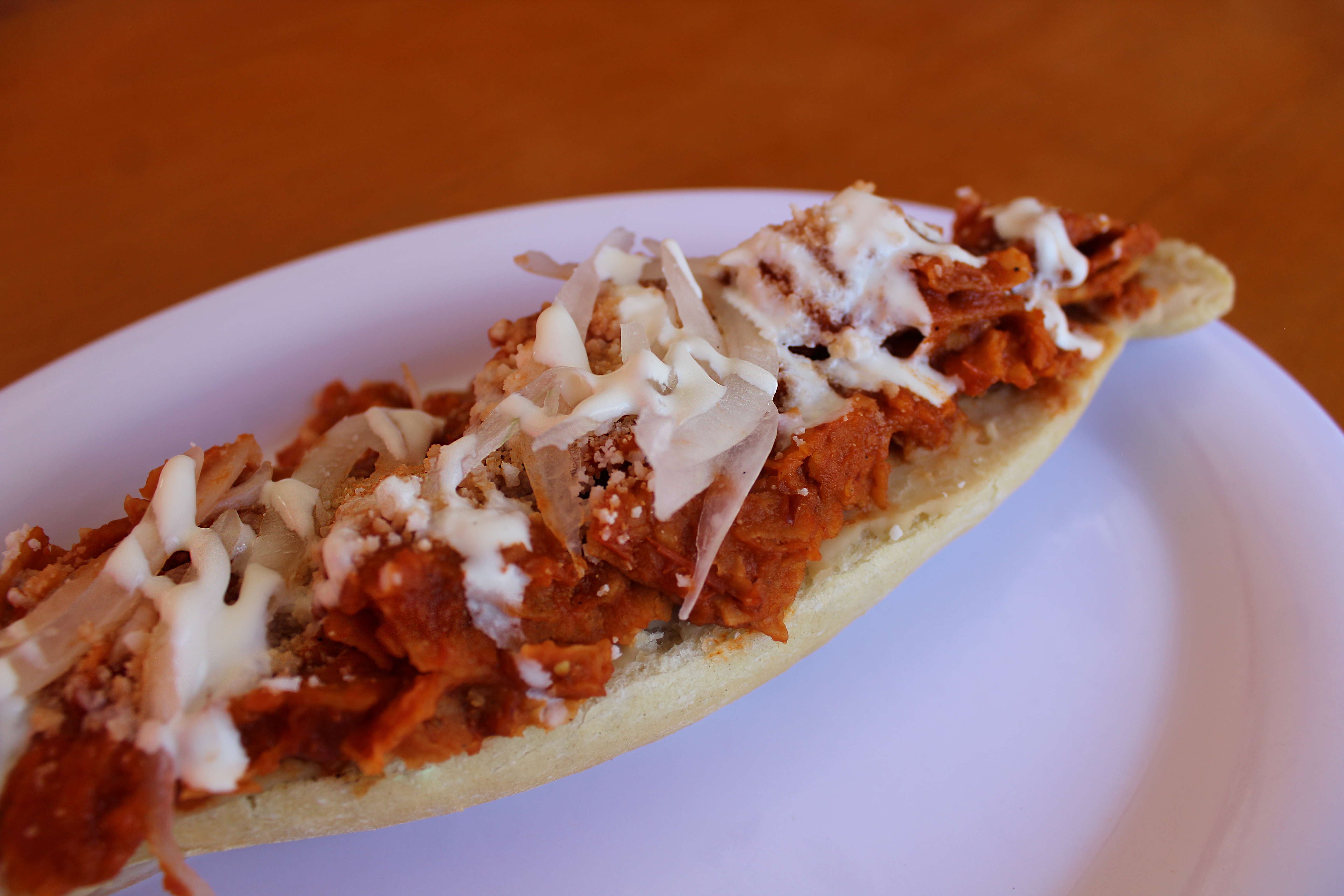 Mollete de medio birote con base de frijoles y chilaquiles rojos o verdes.