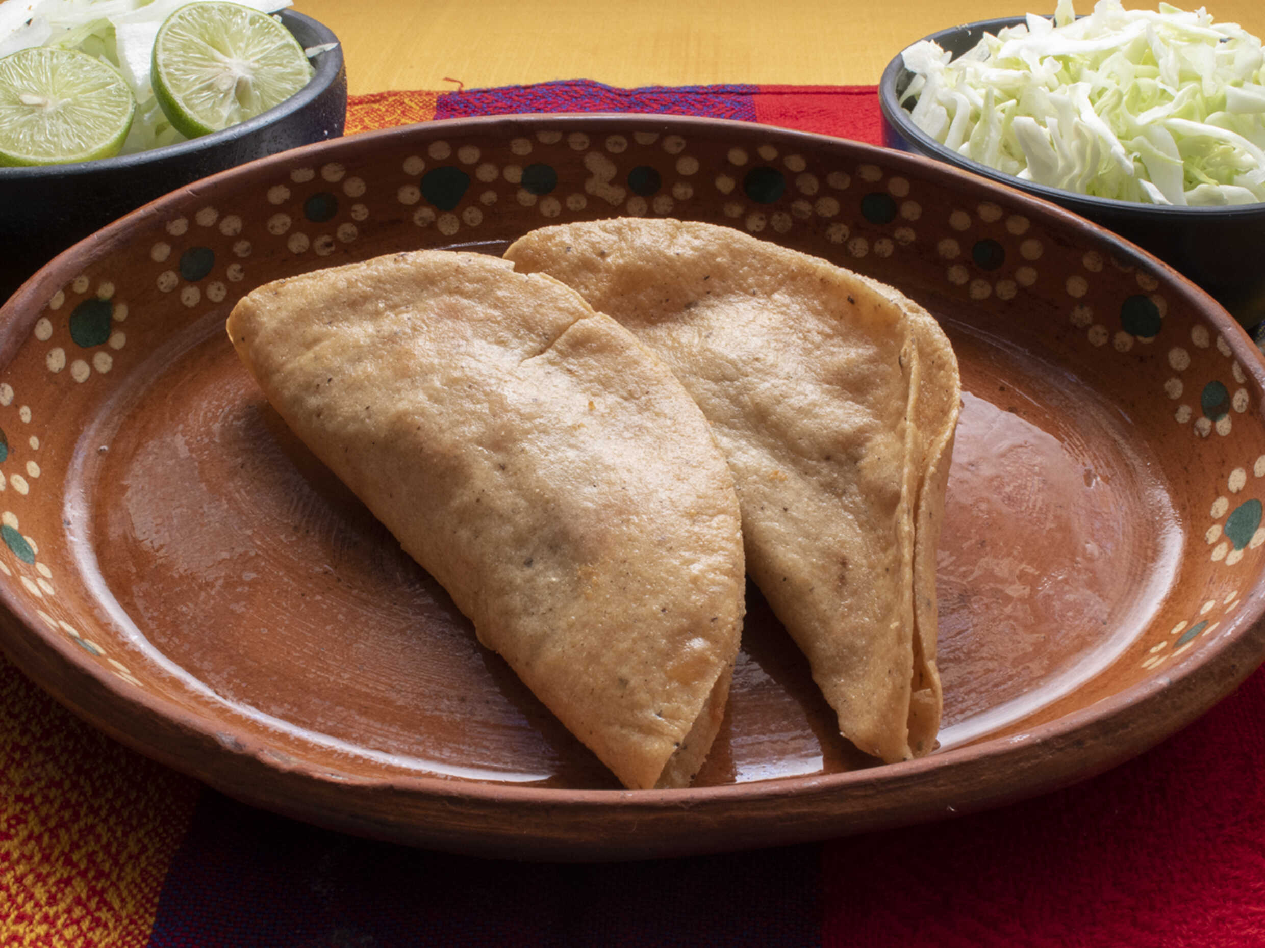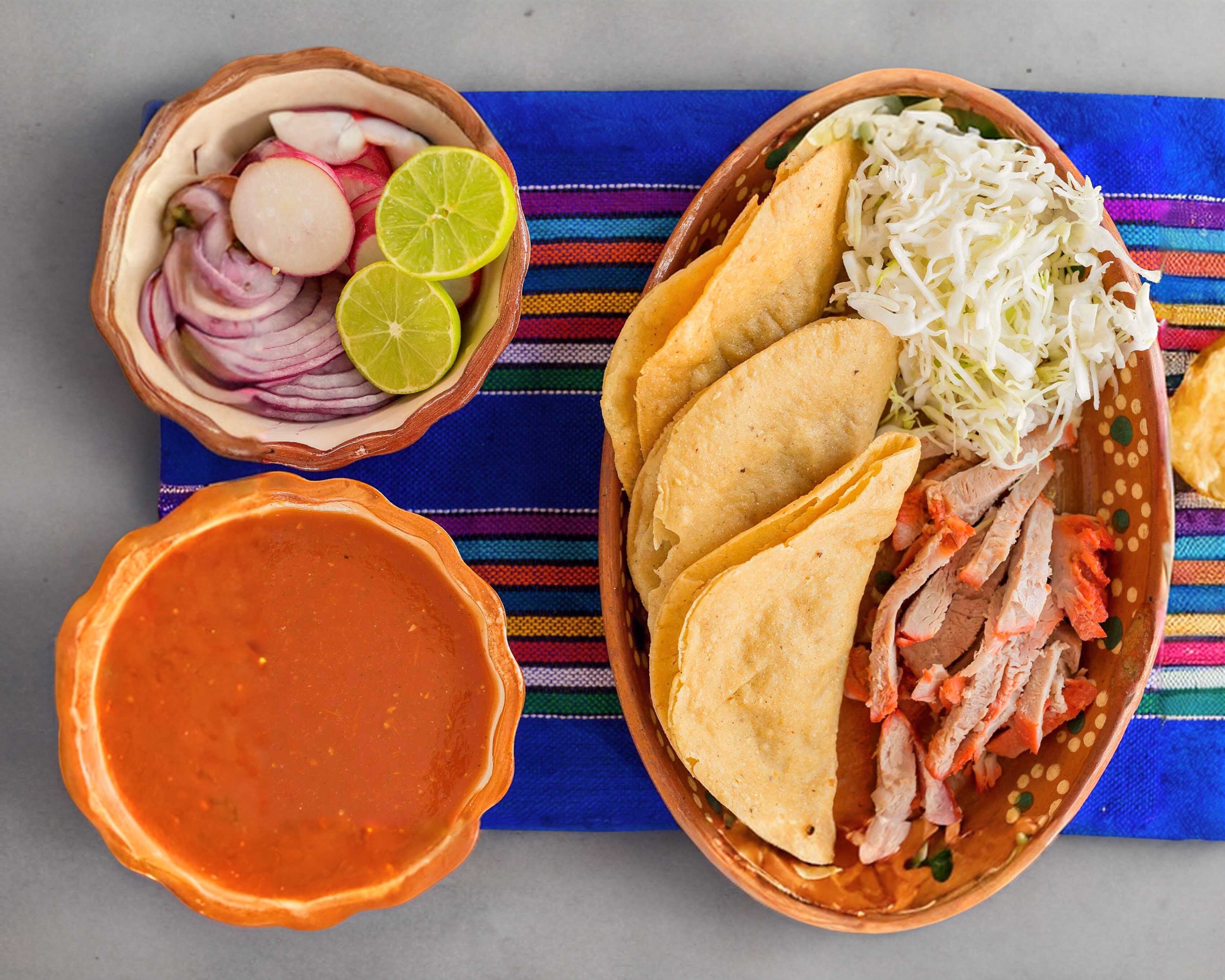 de papa o frijol con carnitas col salsa cebolla con chile y rábanos
