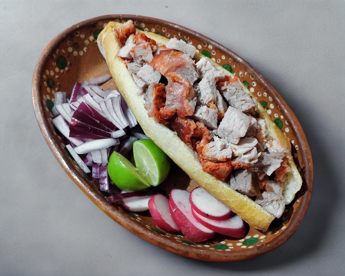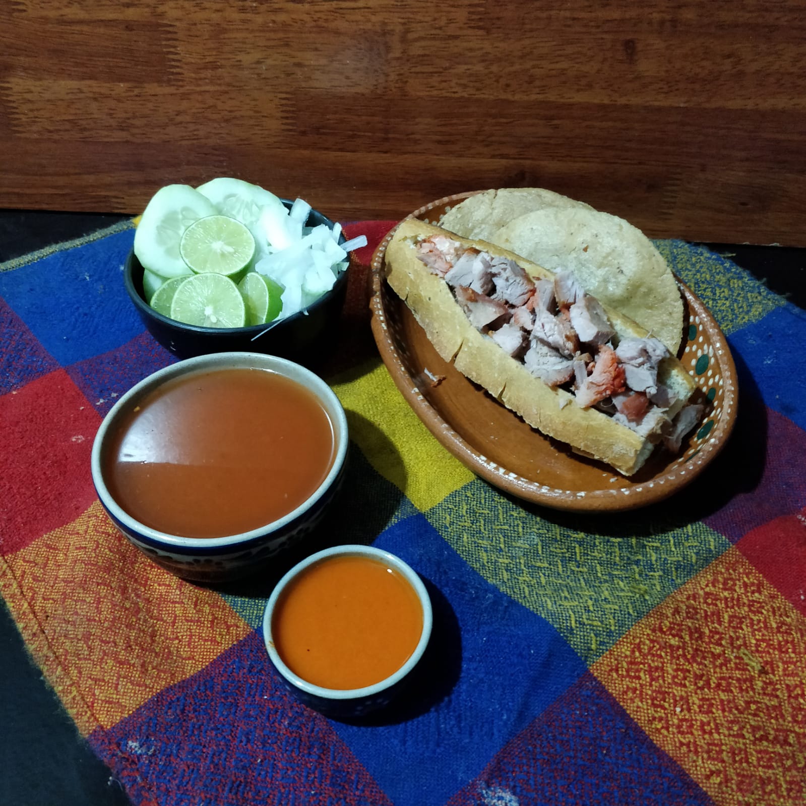 Torta ahogada de carnitas , con salsa, cebolla, con chile limones todo aparte