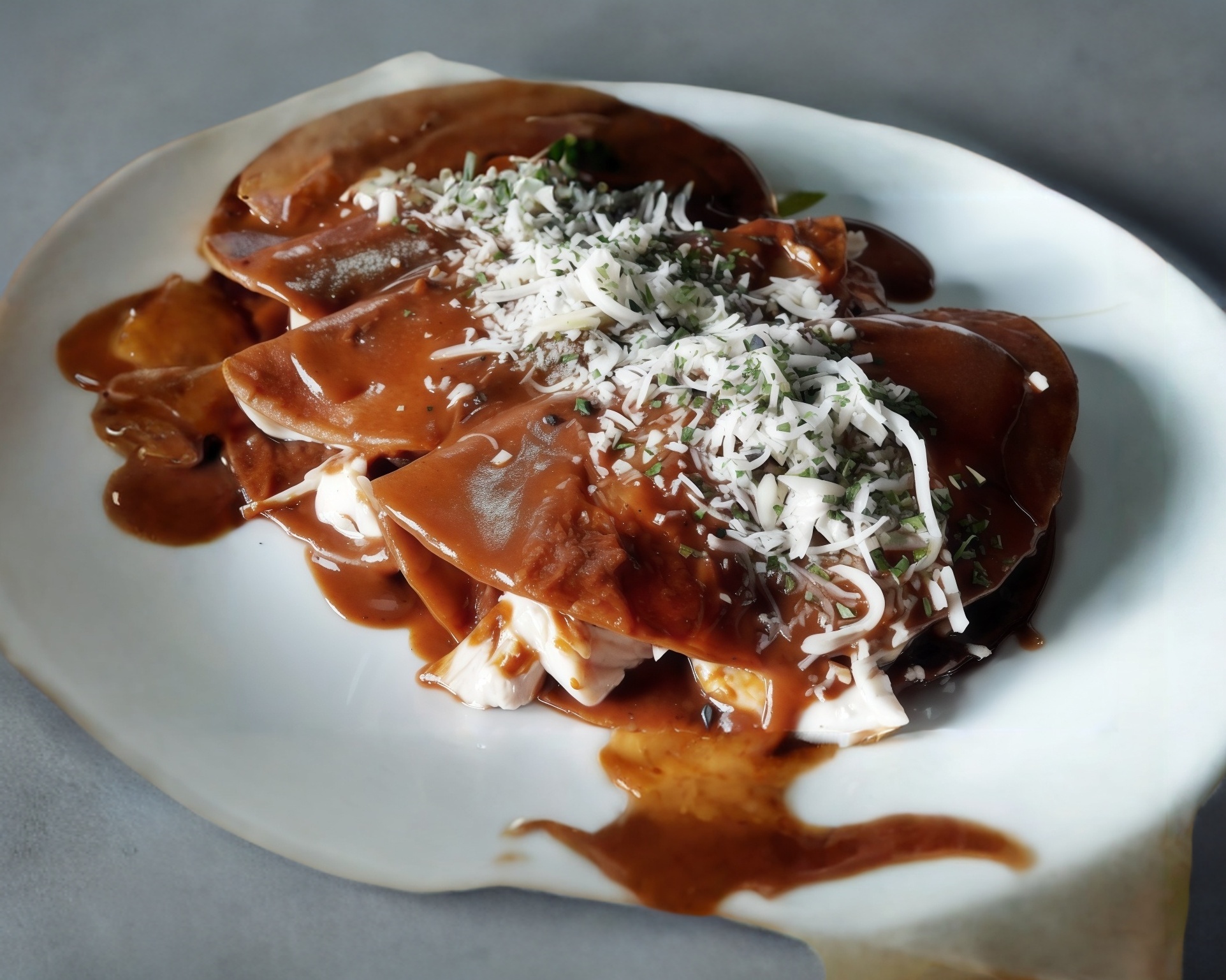 4 Piezas de tortilla de maíz rellena de pollo bañado en mole acompañadas de arroz.