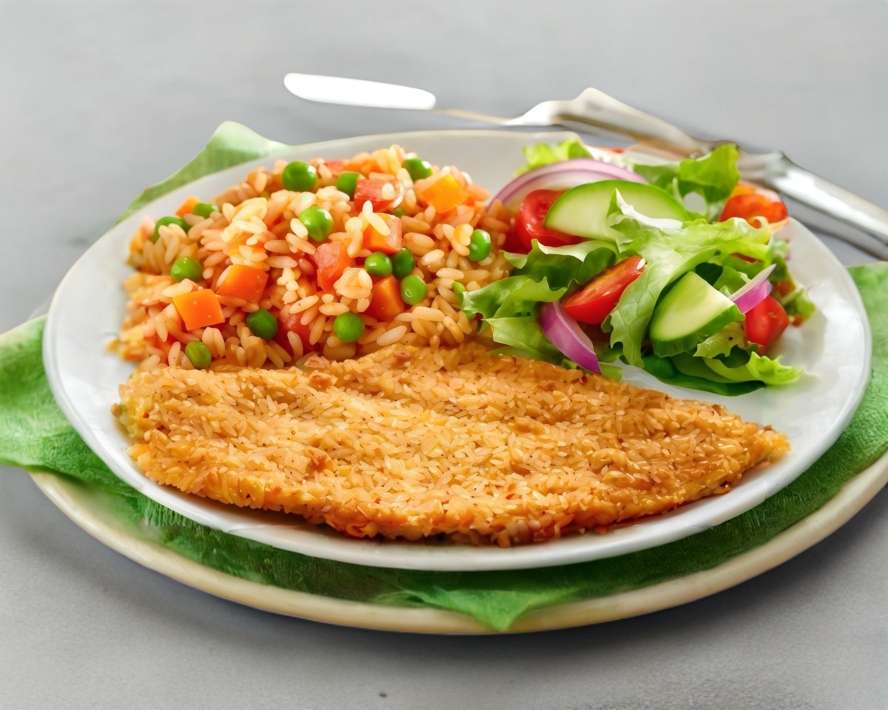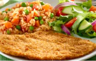 Filete de pollo empanizado acompañado de 2 guarniciones a elegir.