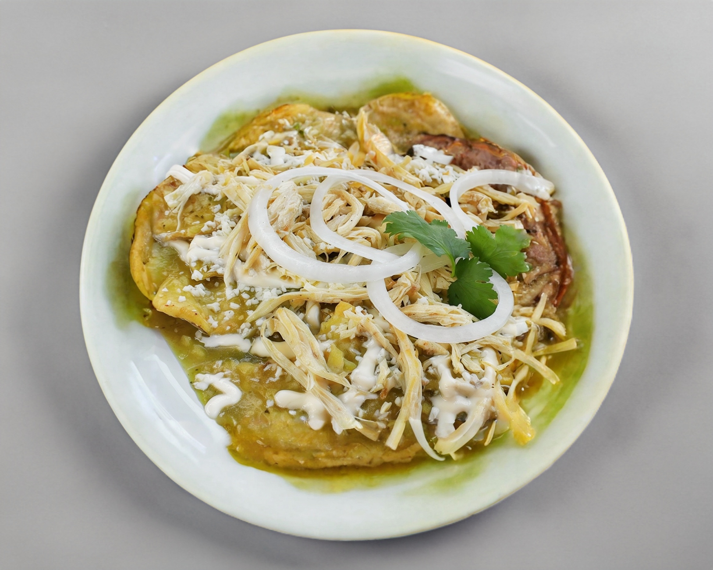 3 Piezas de enchiladas rellenas de pollo, bañadas en salsa verde acompañadas de arroz.