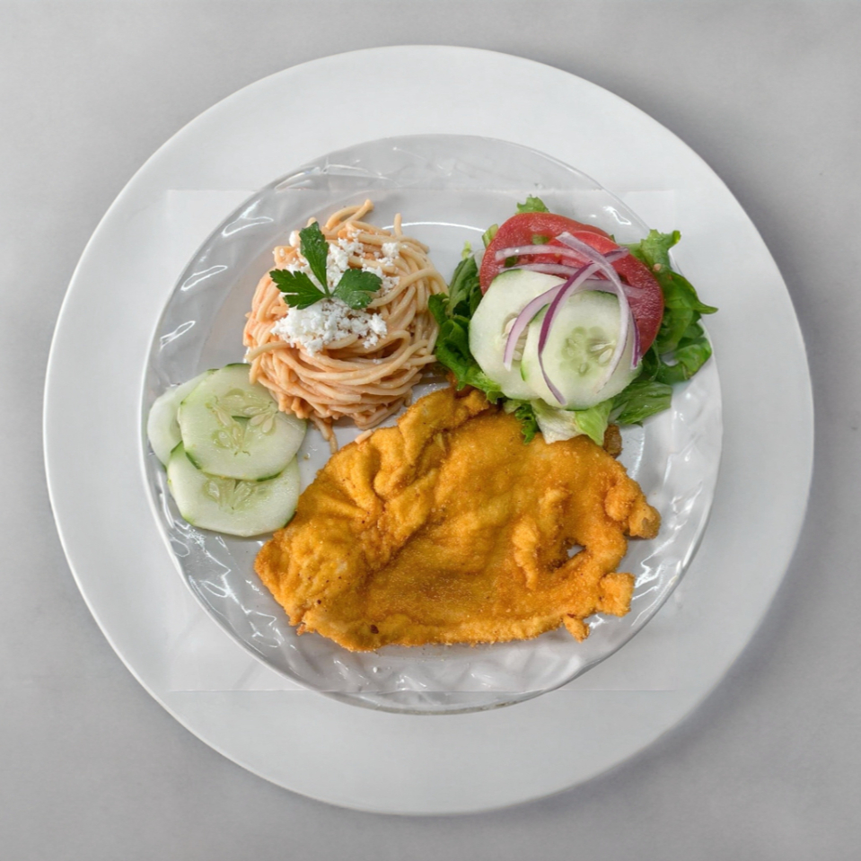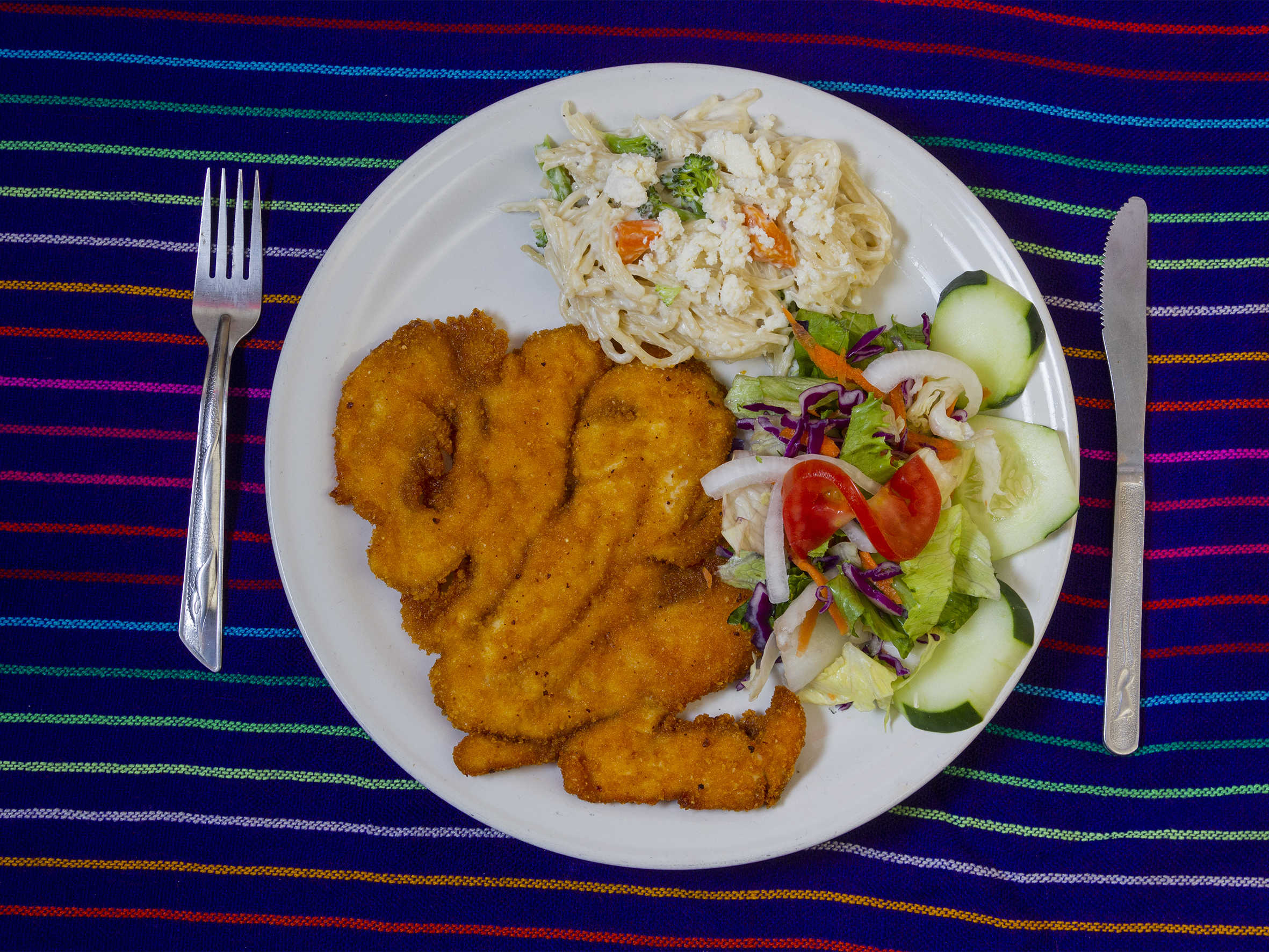 FILETE DE RES O POLLO EMPANIZADO ACIOMPAÑADO DE DOS GUARNICIONES