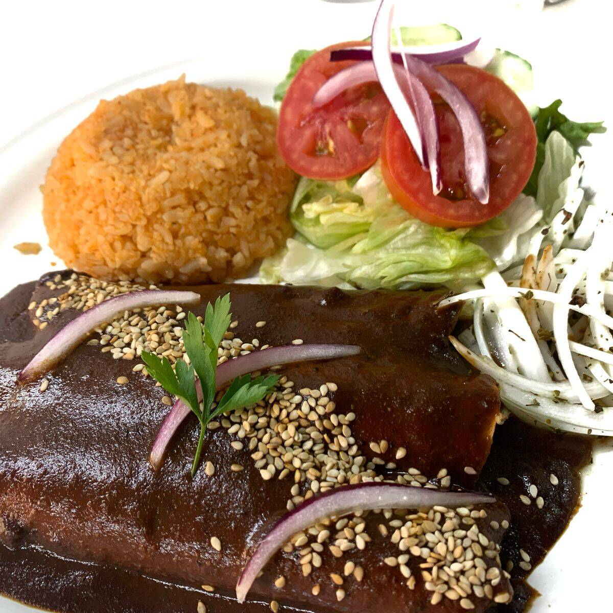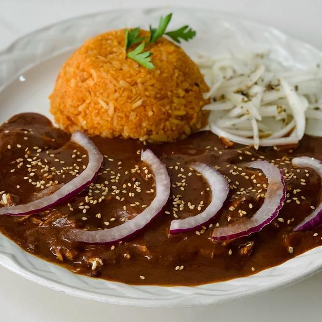 Pollo desehebrado en un mole almendrado de la casa, acompañado de dos guarniciones a elegir