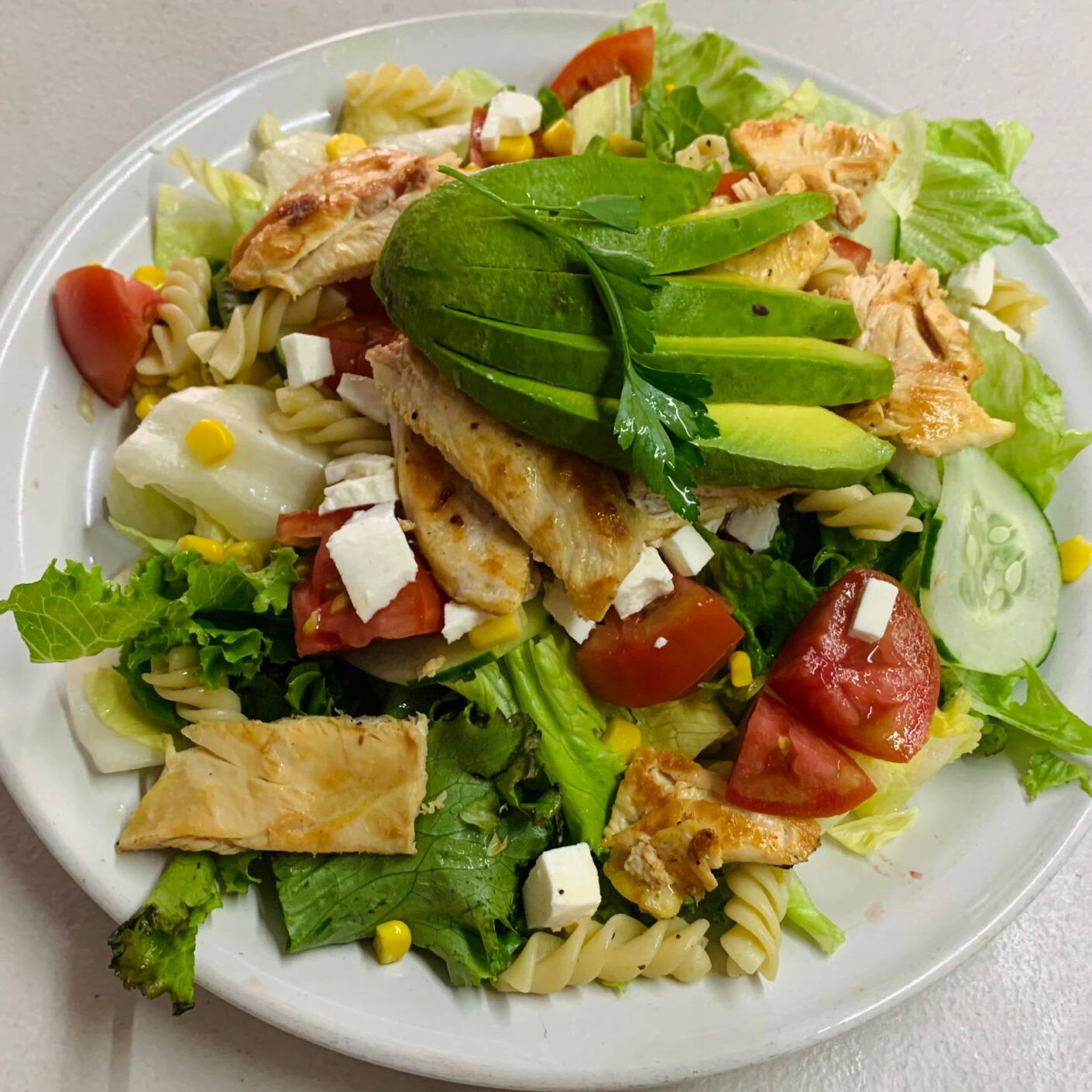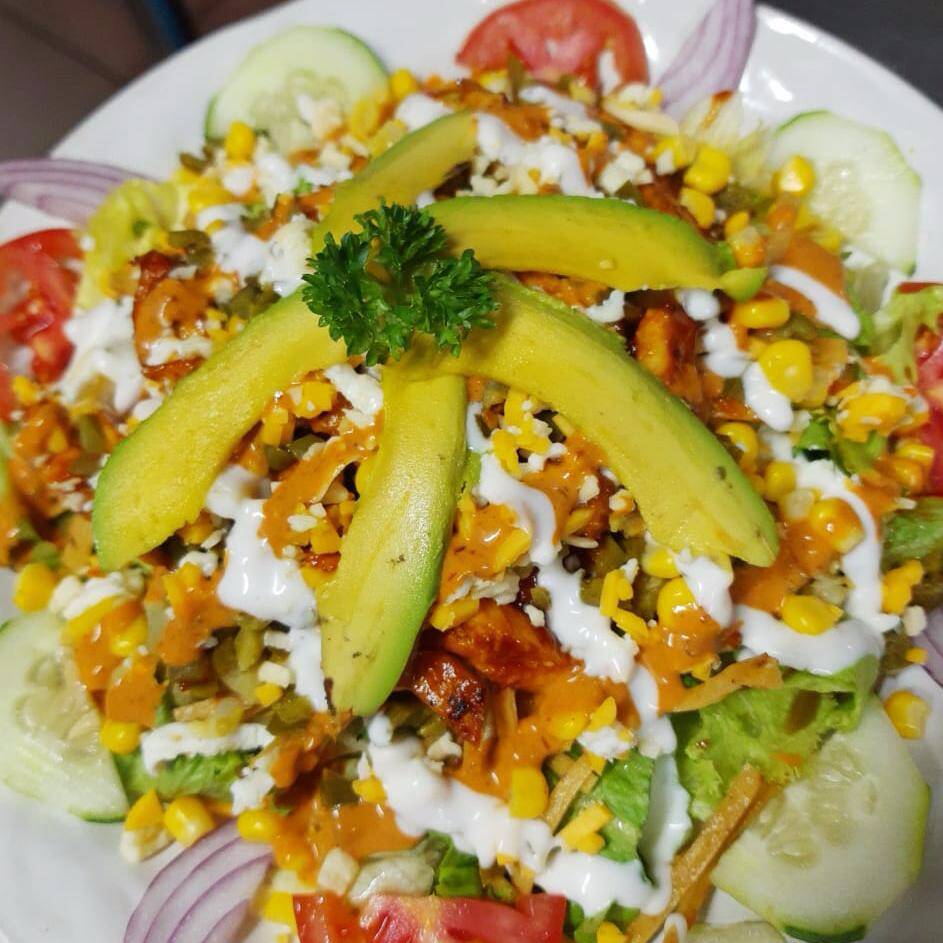FAJITAS DE POLLO A LA BBQ EN UNA BASE DE LECHUGA CON TROZOS DE JITOMATE RODAJAS DE PEPINO TROCITOS DE PANELA Y ELOTE PASTA ABANICO DE AGUACATE ADEREZOS RANCH Y CHIPOTLE ACOMPAÑADA DE TOSTADAS Y GALLETAS SALADAS
