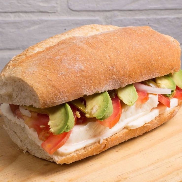 Pan integral con pollo a la plancha, lechuga, jitomate, cebolla, adherezos opcional.