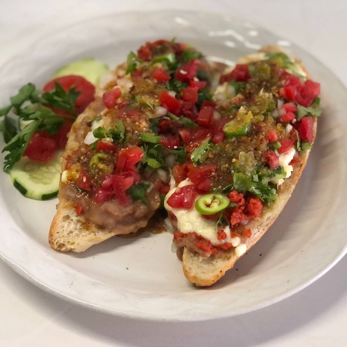 INCLUYE DOS PIEZAS CON FRIJOLES, QUESO GRATINADO Y SALSA A LA MEXICANA