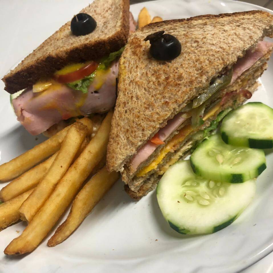 Sandwich de dos pisos con jamon, queso, tocino acompañado de papas a la francesa.