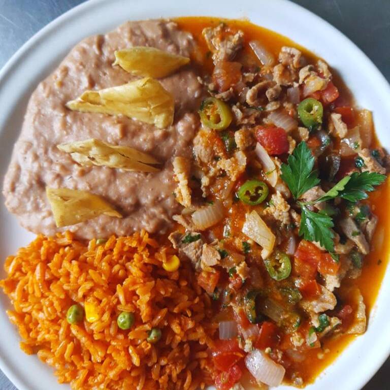 CARNE DE PUERCO EN SALSA DE TOMATE NO PICOSA, ACOMPAÑADA DE DOS GUARNICIONES