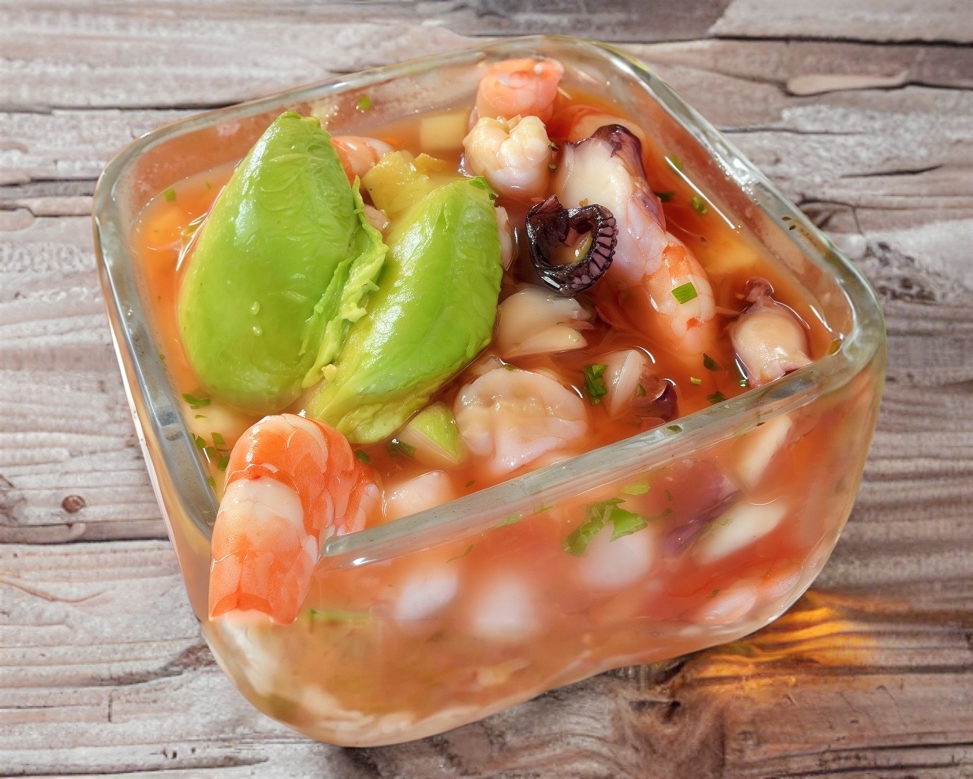 Delicioso cóctel de camarón con jitomate pepino cebolla y caldo de camarón