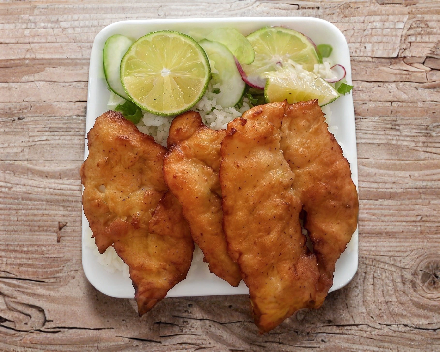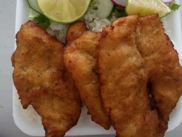 Filete de pescado de la mejor calidad empanizado acompañado de arroz y ensalada de lechuga