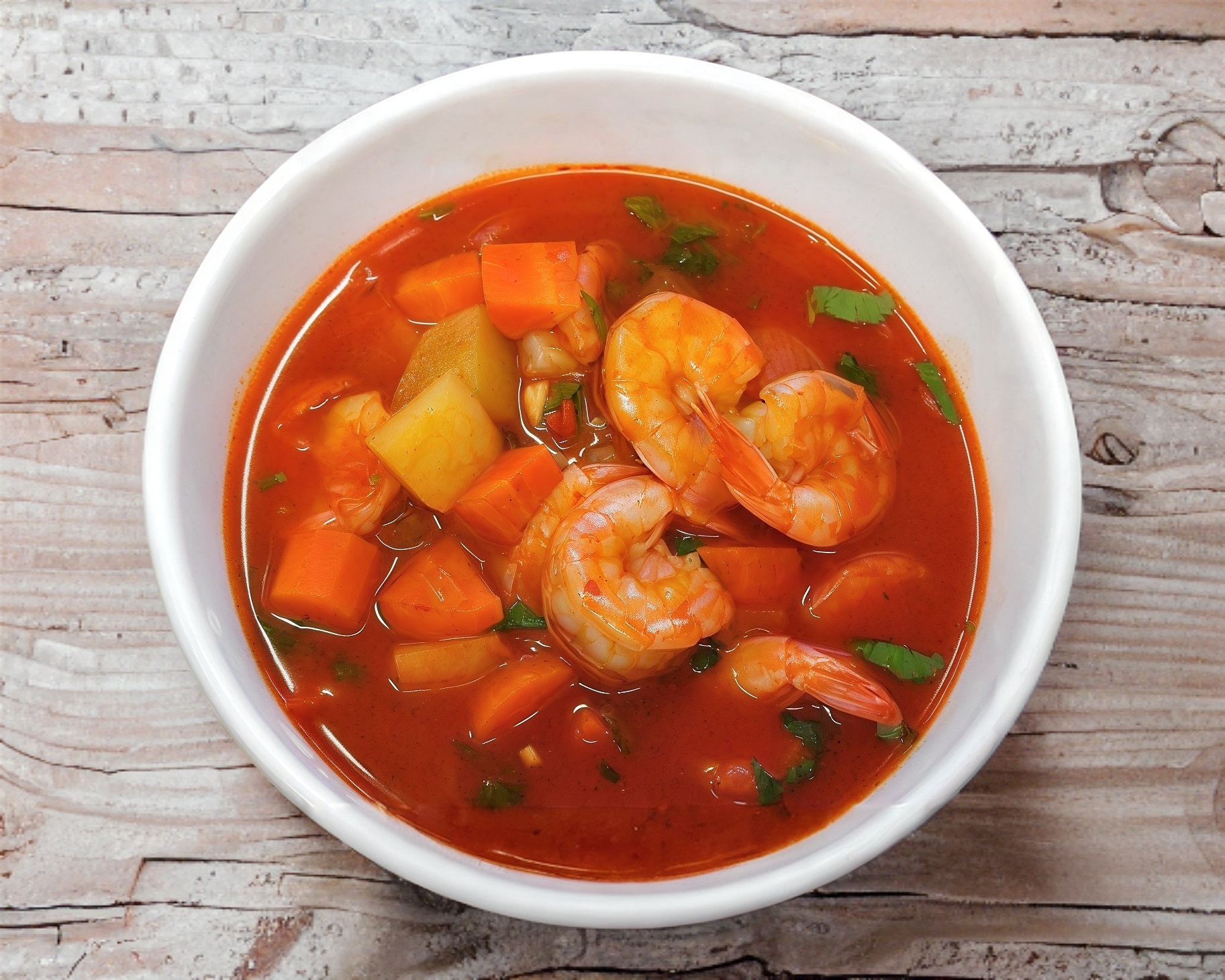 Caldo caliente camarones cocidos con mix de verduras chayote papá y zanahorias