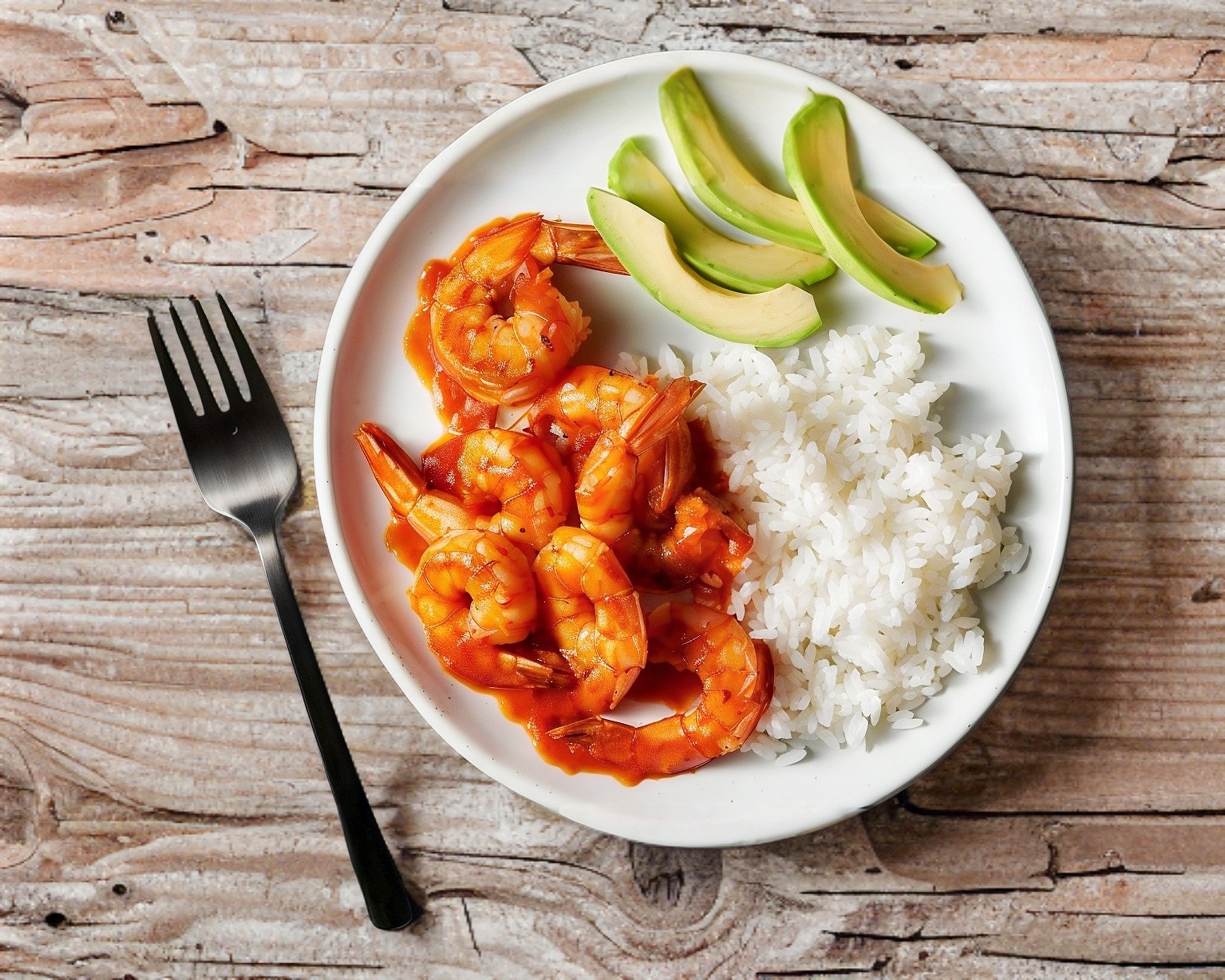 Camarones a la diabla acompañado de arroz y ensalada de lechuga