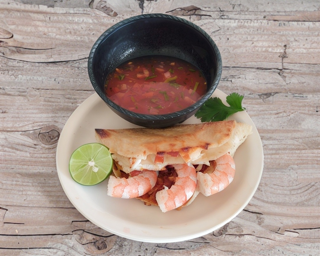 Camarón en trozo tipo machaca ,tortilla de maíz y delicioso queso derretido doradito a la plancha