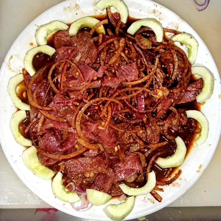 Atún curtido en limón, acompañado de cebolla, pepino y salsa negra.