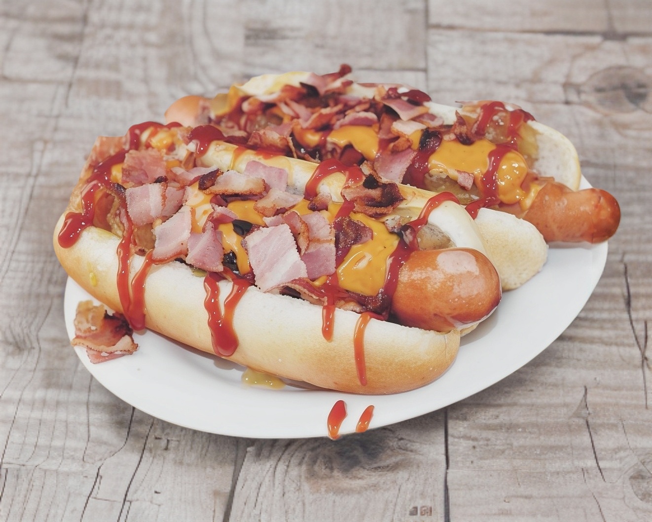Delicioso hotdog ,con salchicha envuelto en tocino y tortilla deharina con quezo gratinado