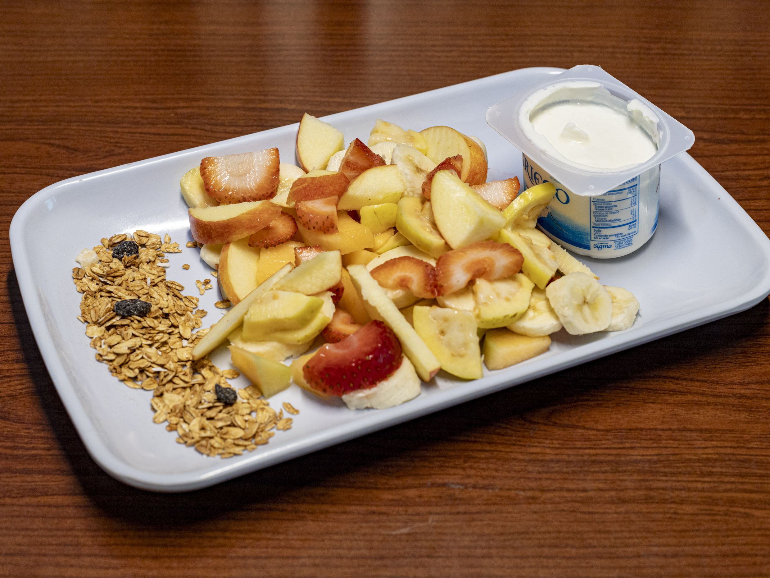Plato de Frutas de temporada, acompañado con yogurt natural, miel y granola,