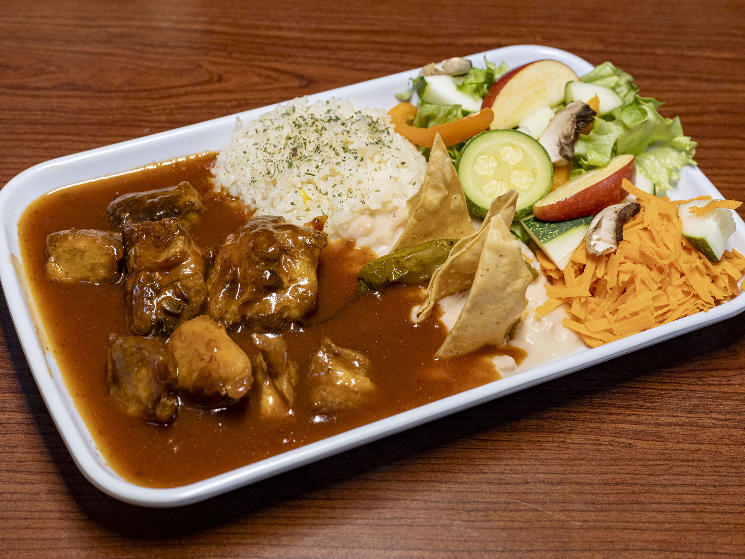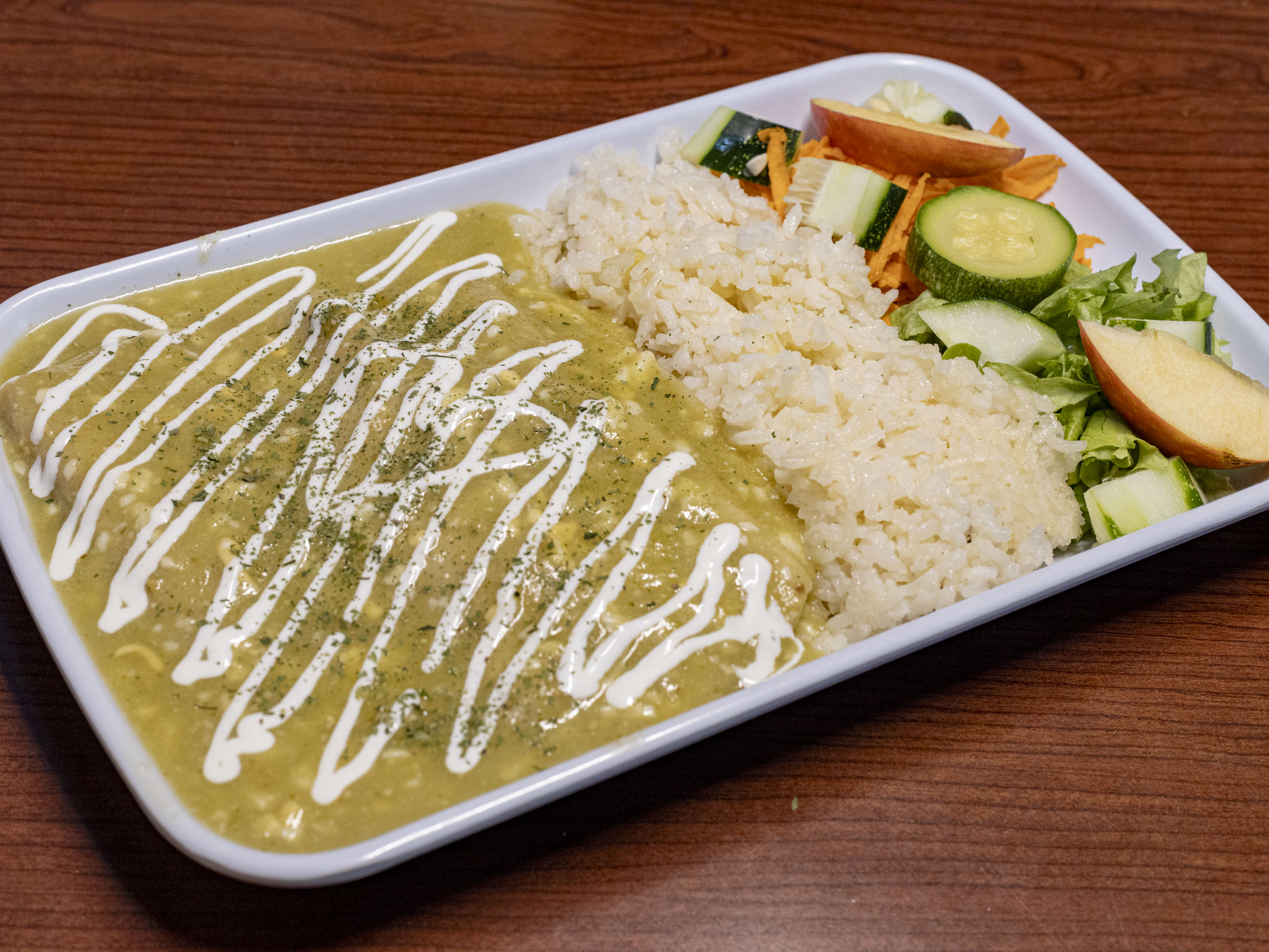 3 enchiladas con pollo, queso y salsa verde, acompañadas de arroz y ensalada de la temporada