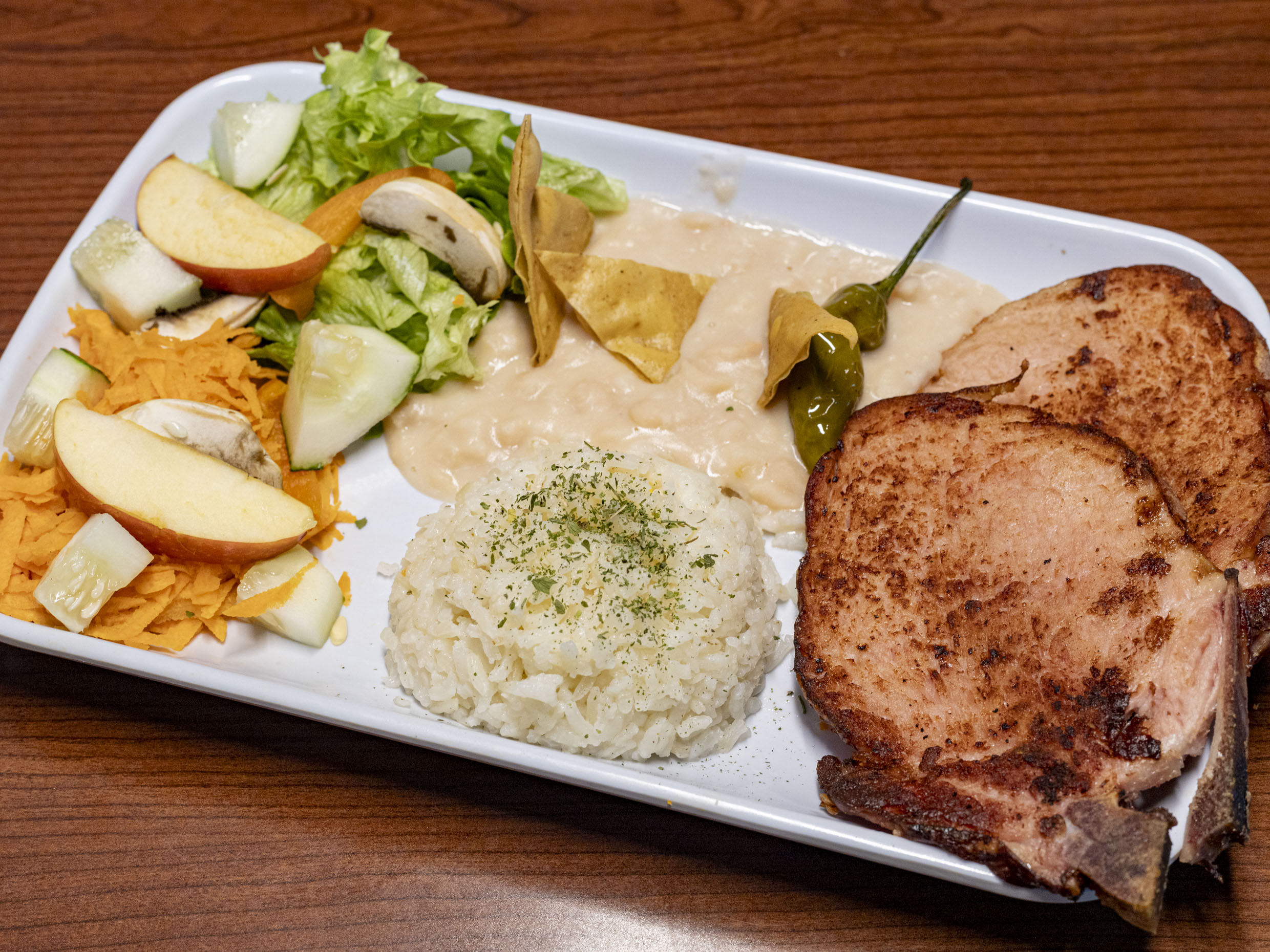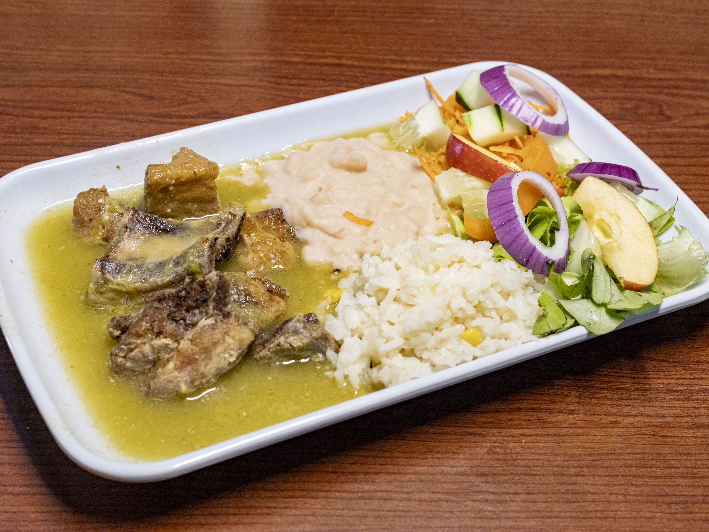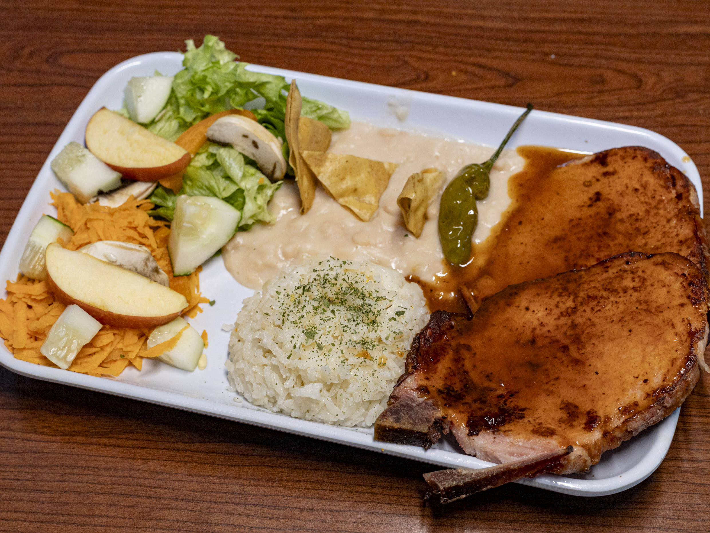 Puedes elegir bistec o cerdo, en chile acompañada de frijoles y arroz, ensalada de la temporada.