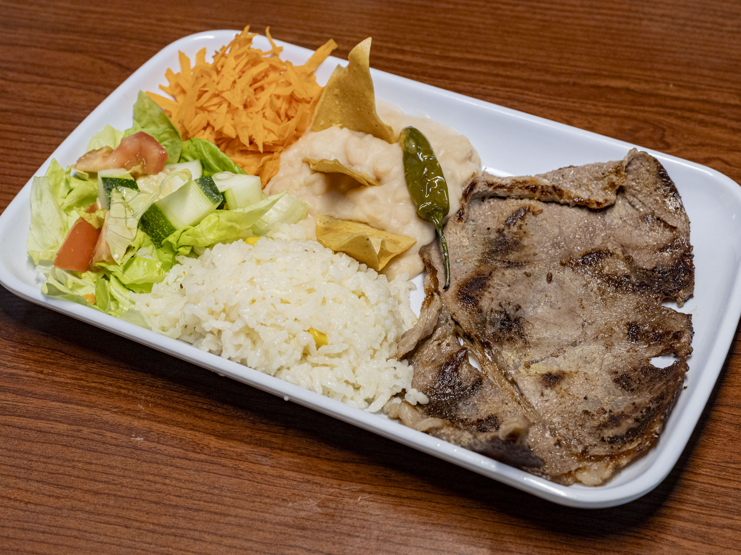 Asada acompañada de frijoles, arroz y y ensalada de la temporada.