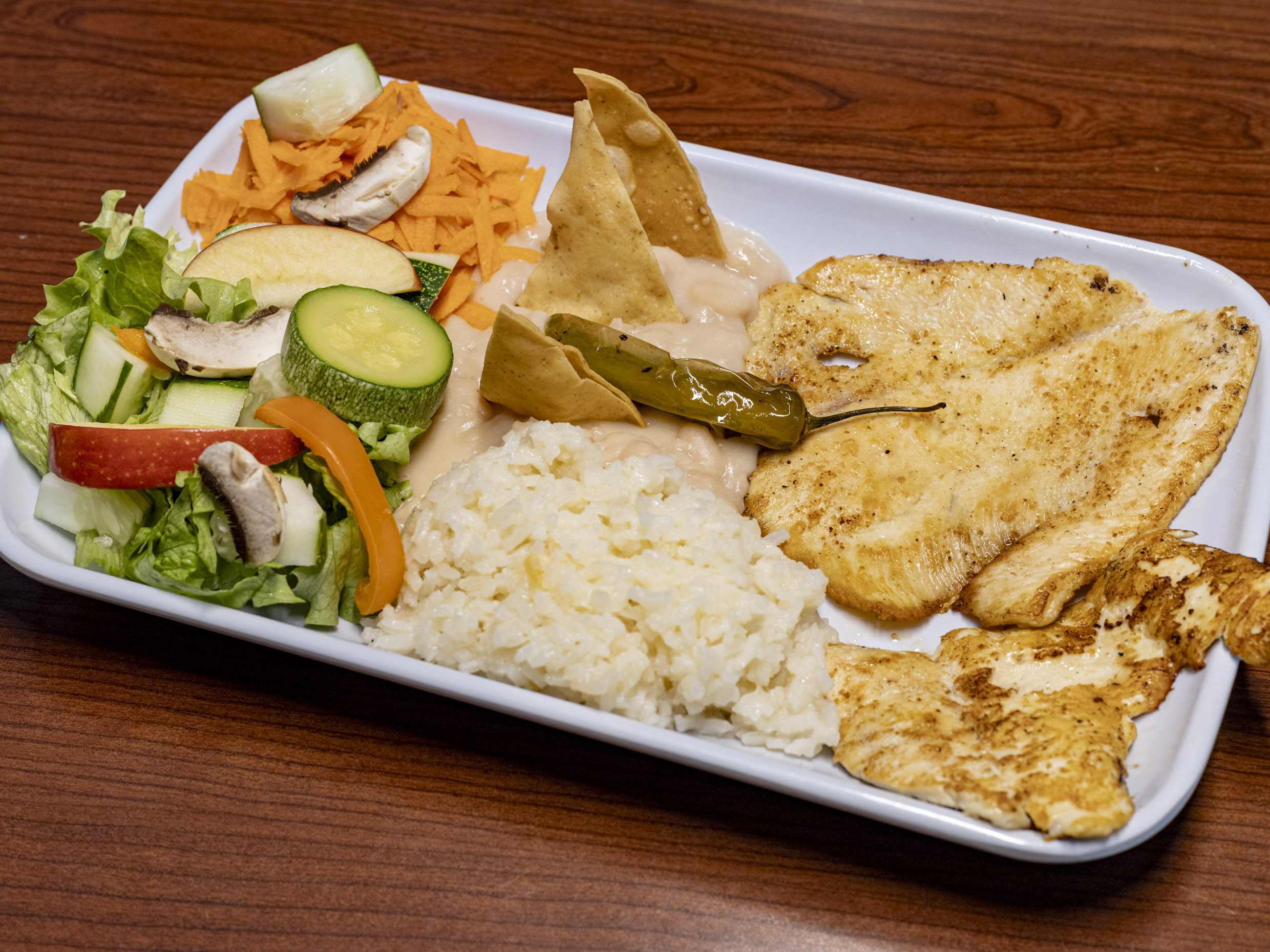 Pollo a la plancha acompañado de frjoles arroz y y ensalada de la temporada.