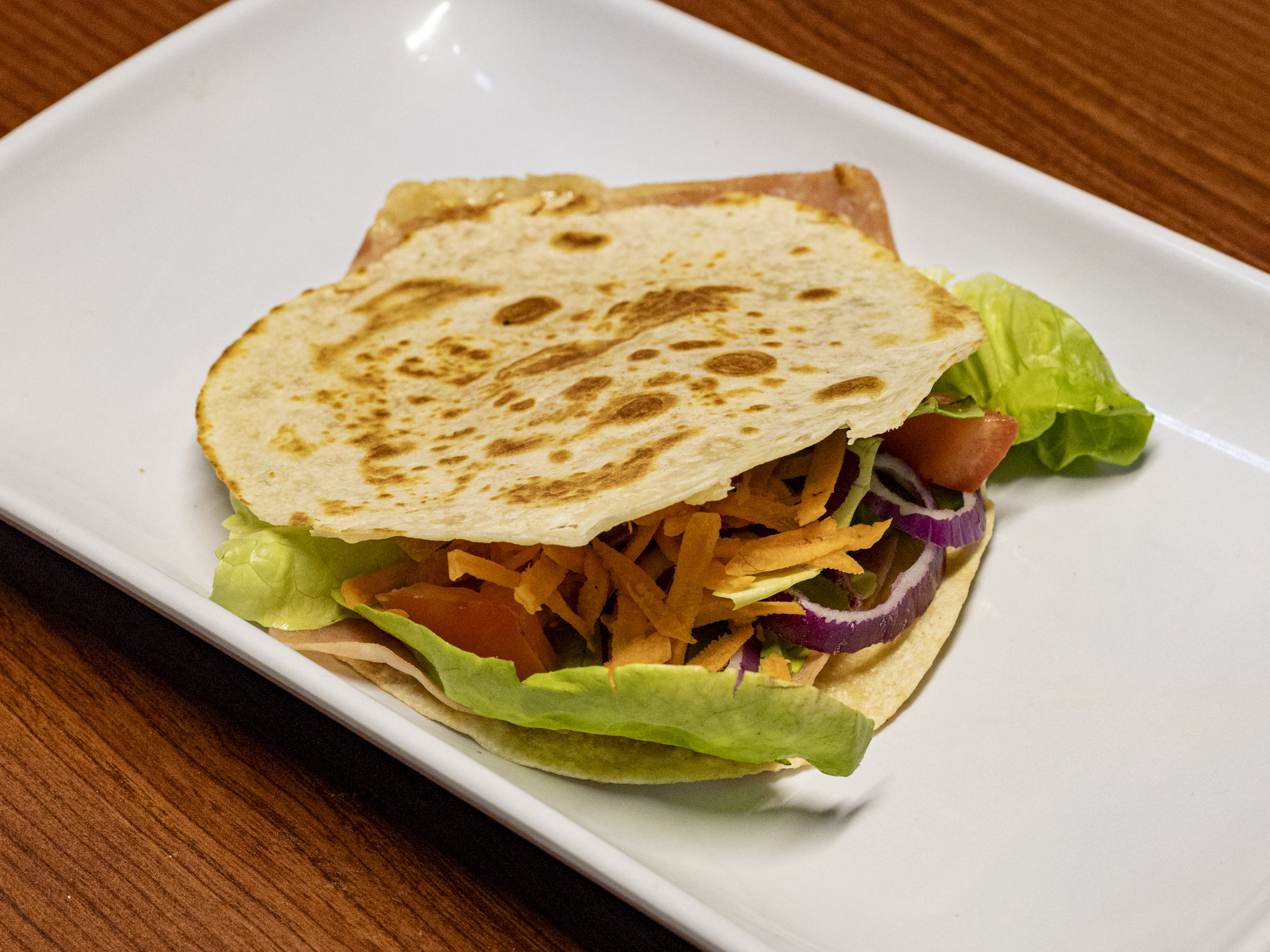 Sincronizada con jamon, queso, lechuga, jitomate, cebolla y salsa aparte.
