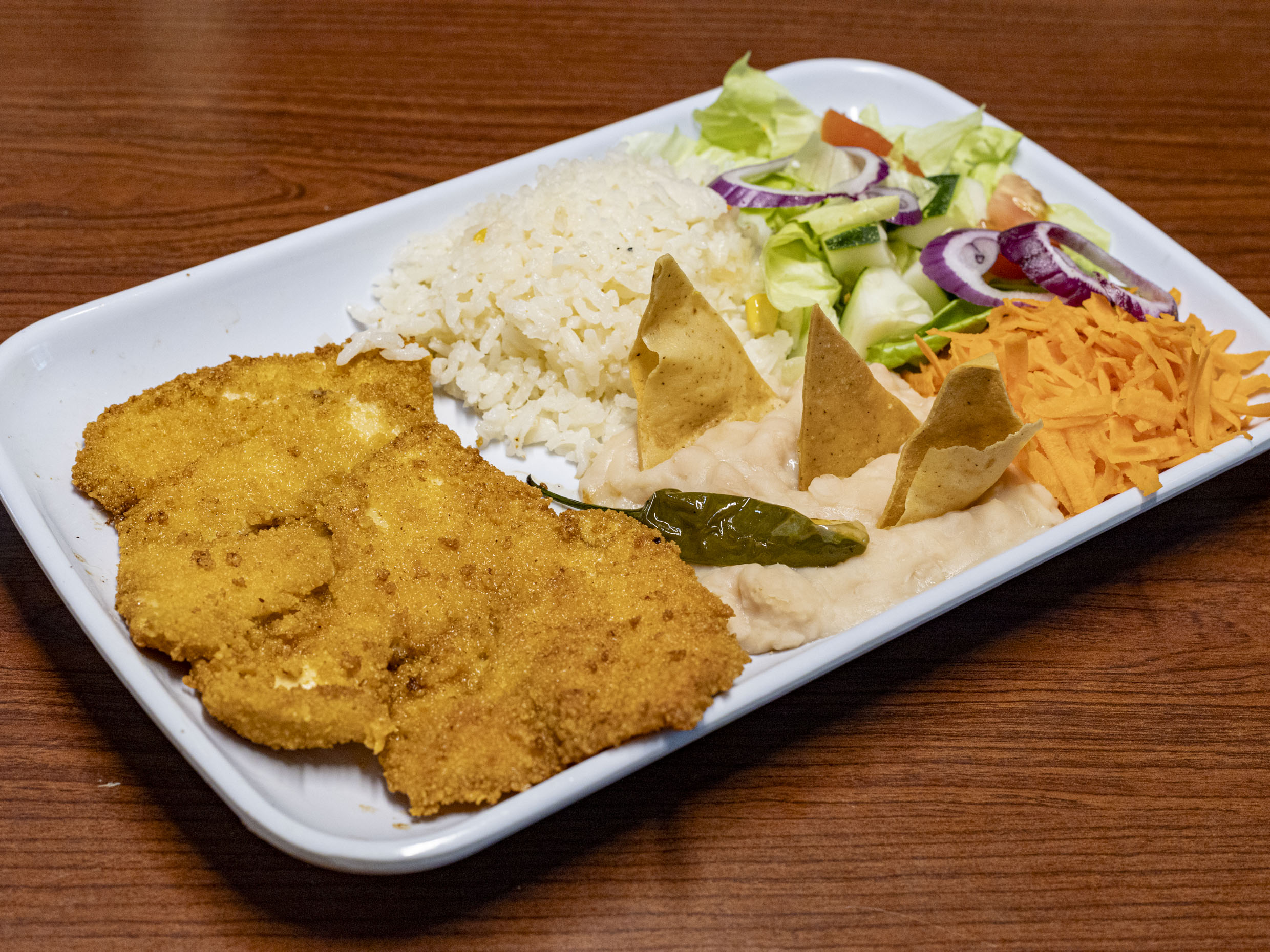 Milanesa acompañada de frijoles, arroz, y ensalada de la temporada.y tortillas.