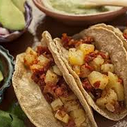 Bistec jugoso con papas, servido en tortilla suave para un taco lleno de sabor auténtico.