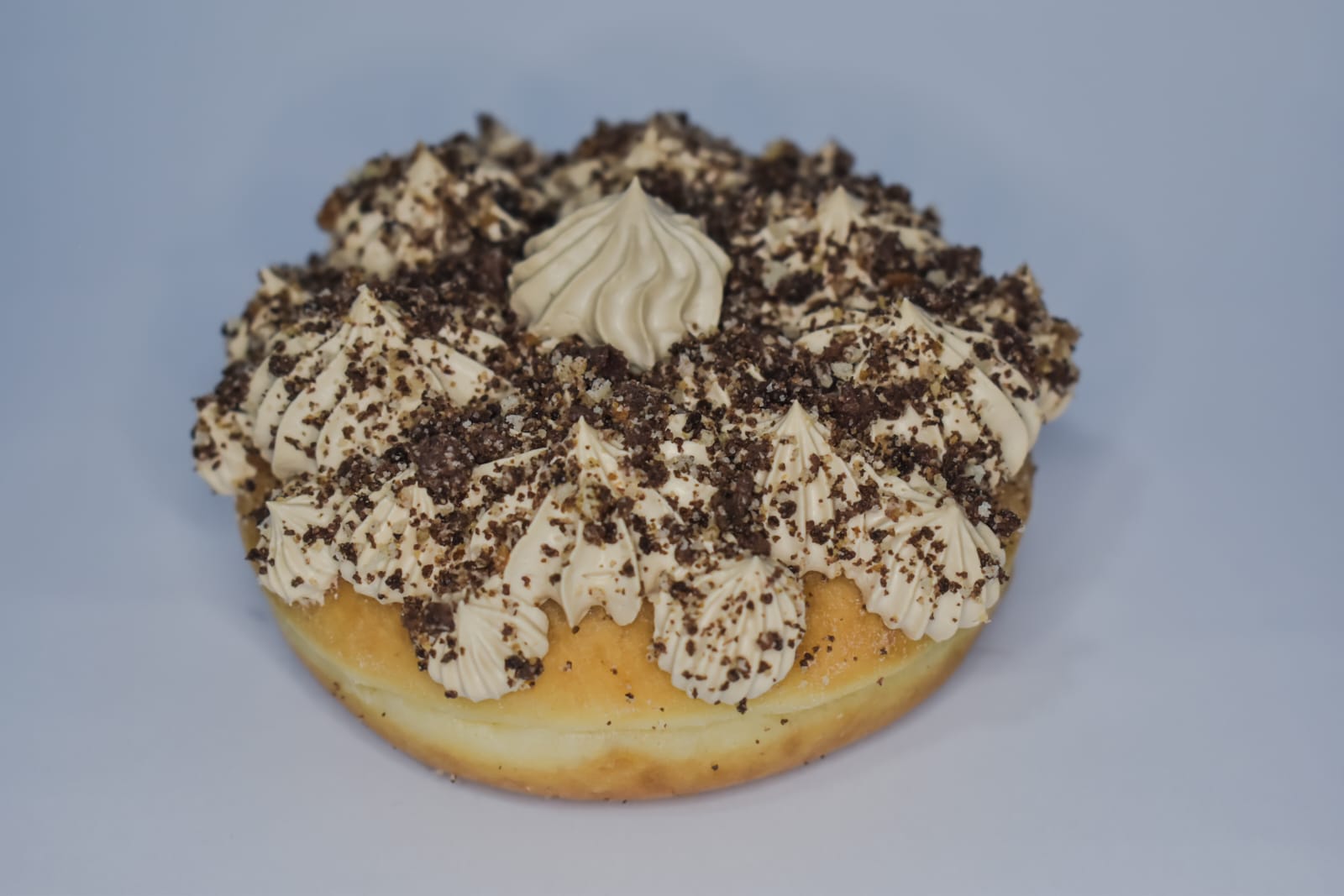 1 deliciosa Dona de moka, con chantilli y café acompañada con bolitas de chocolae