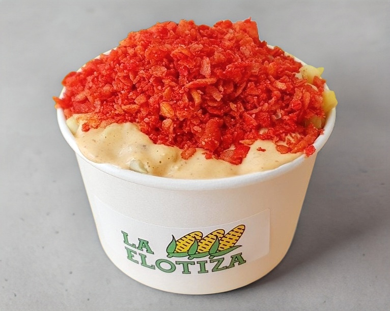 Aderezo chipotle, queso cheddar, carne asada y tocino imitación tocino en vaso de 12 onzas con aproximadamente 230 gramos de contenido y Takis Fuego en vaso de 12 onzas con aproximadamente 300 gramos de contenido.