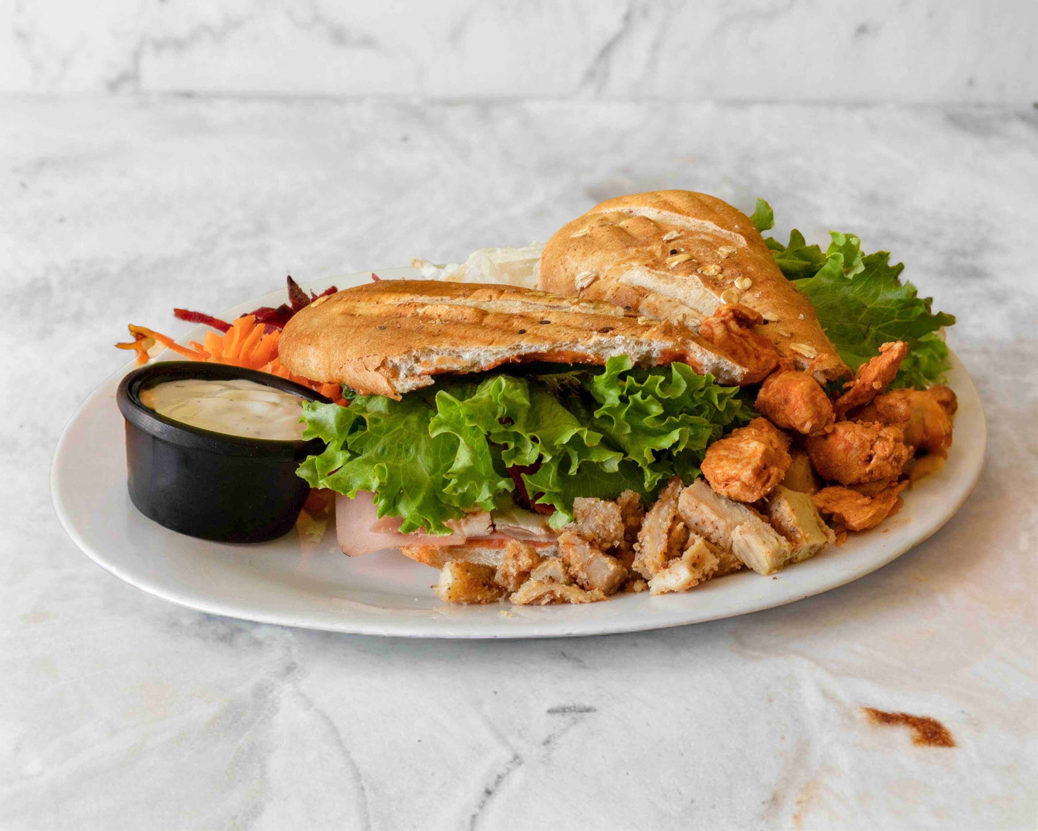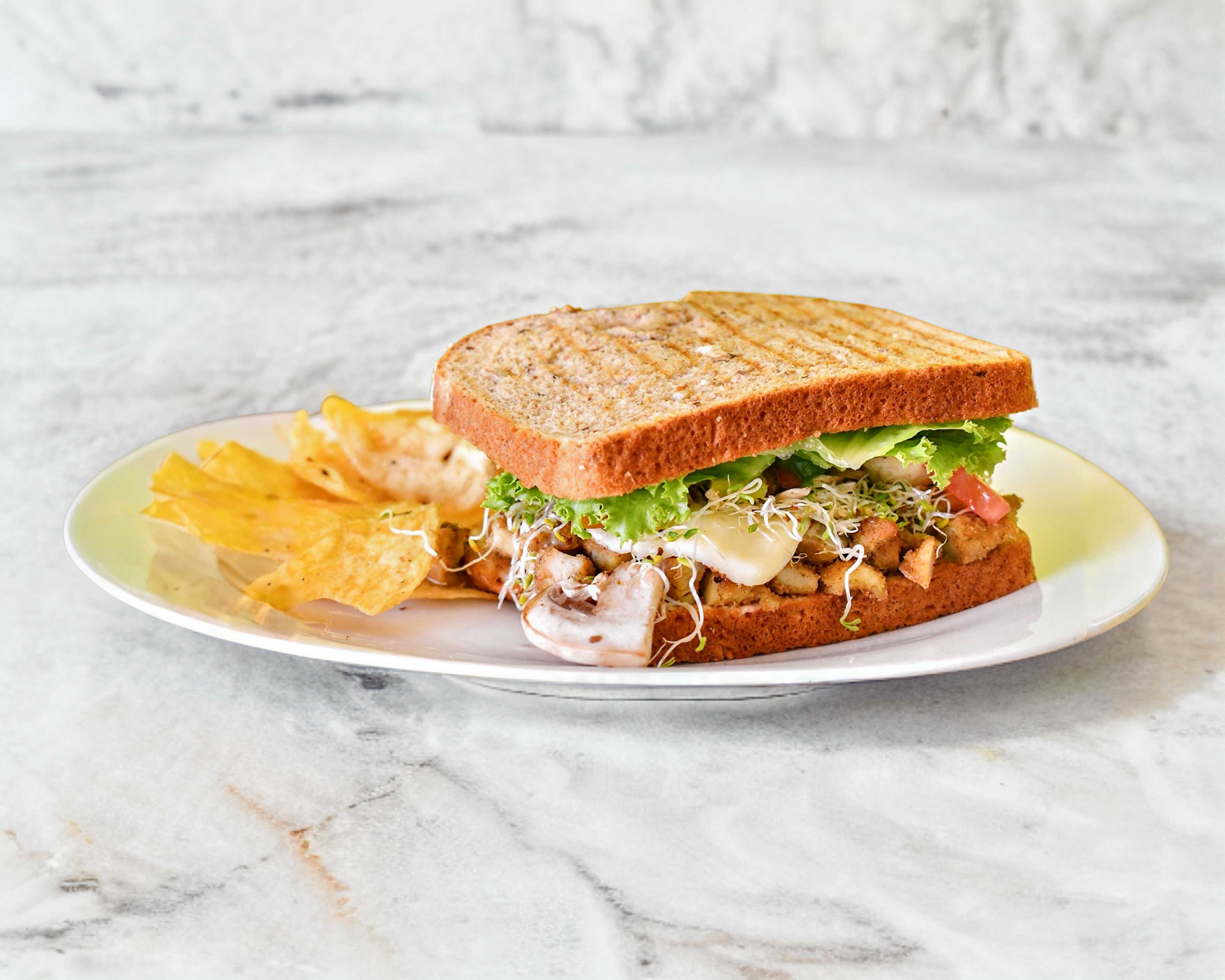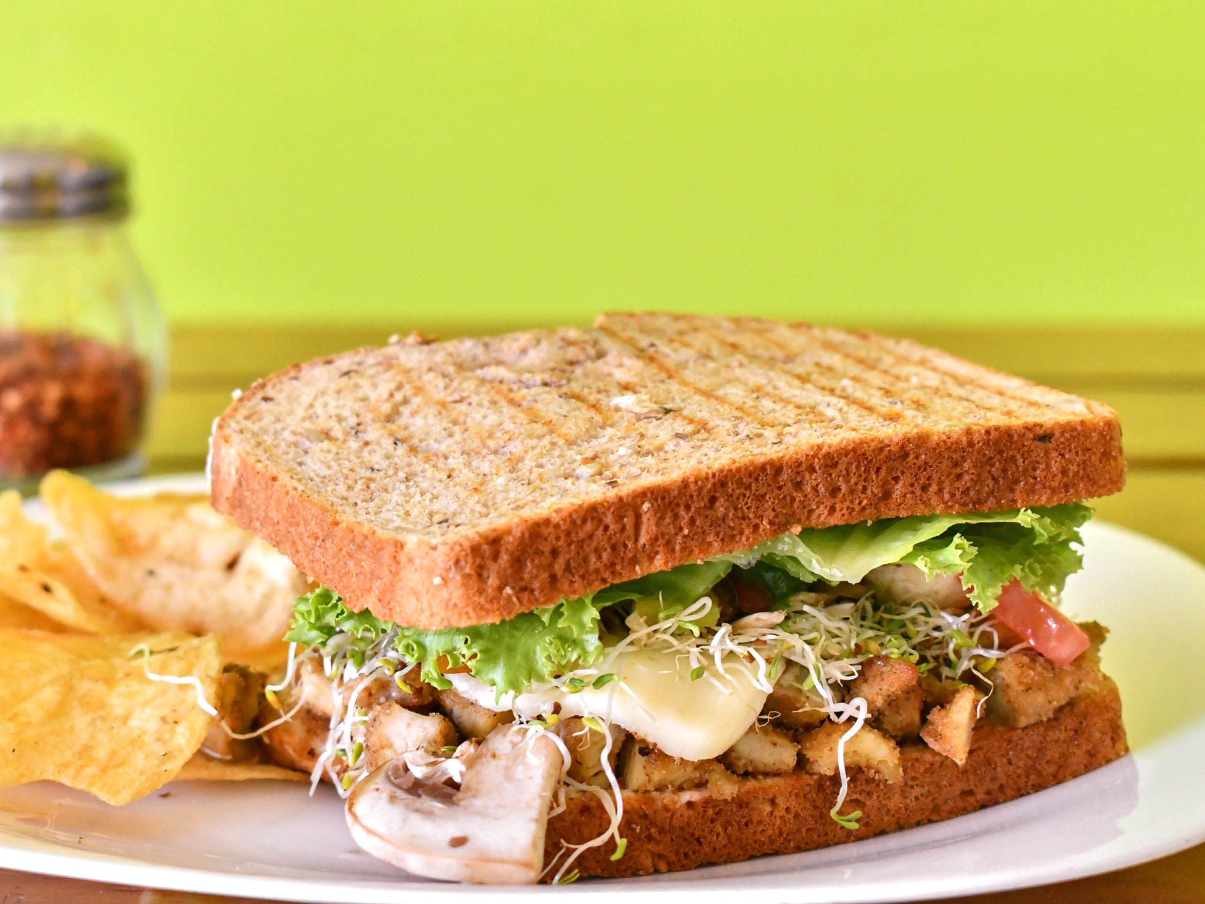 Pollo empanizado, queso Gouda, germinado alfalfa, champiñón, jitomate, morrón, lechuga y aderezo.