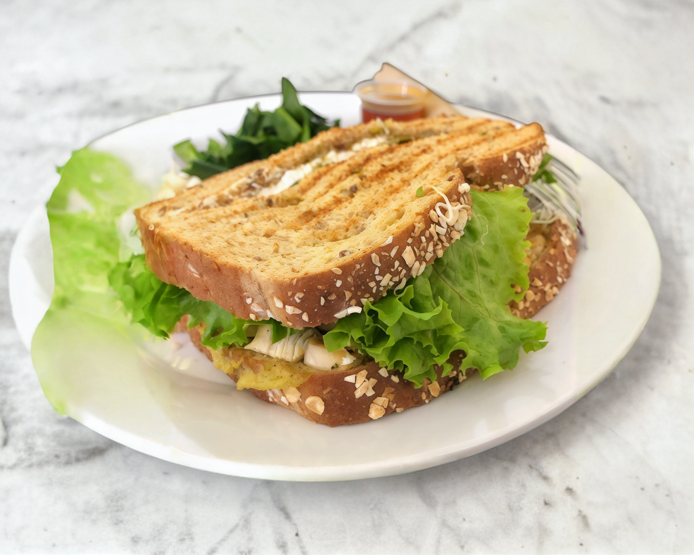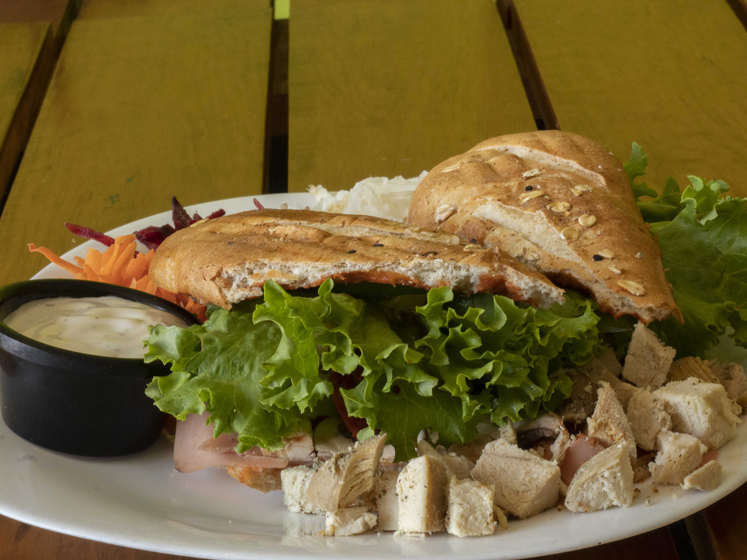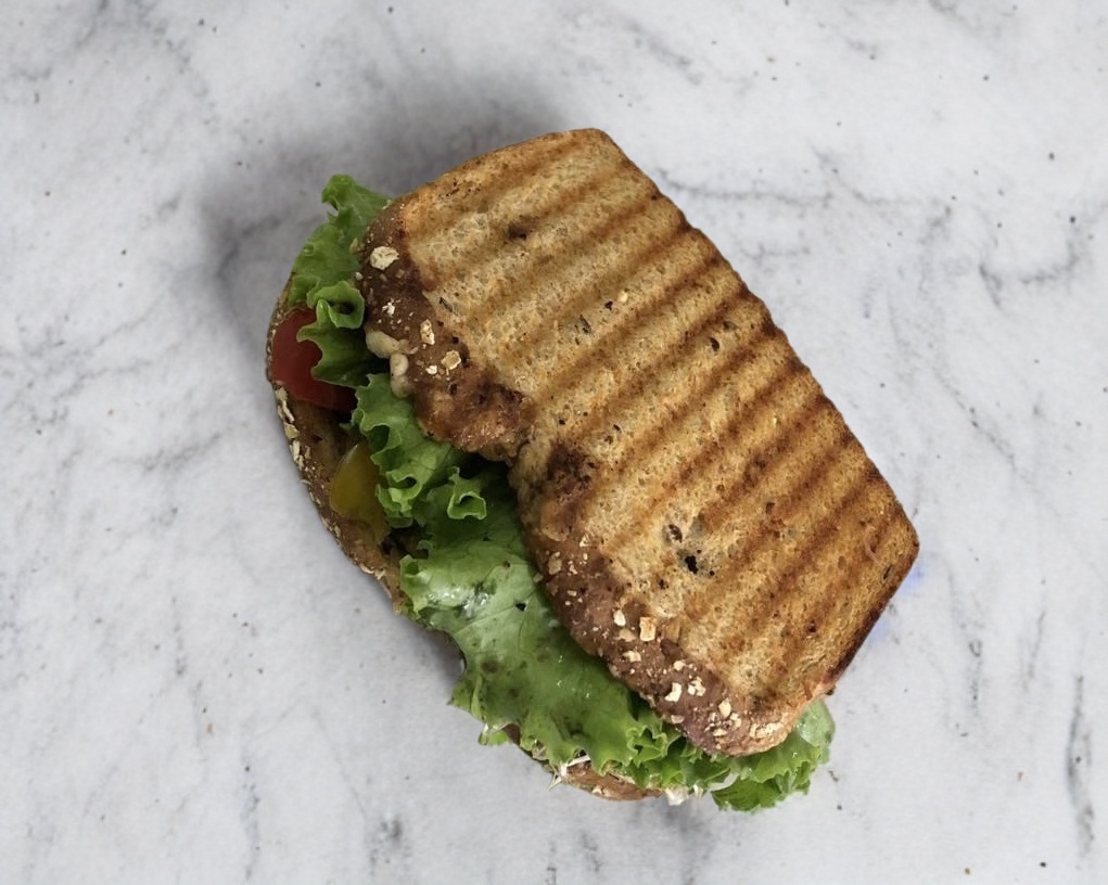 Pollo empanizado, queso Gouda, germinado alfalfa, champiñón, jitomate, morrón, lechuga y aderezo.
