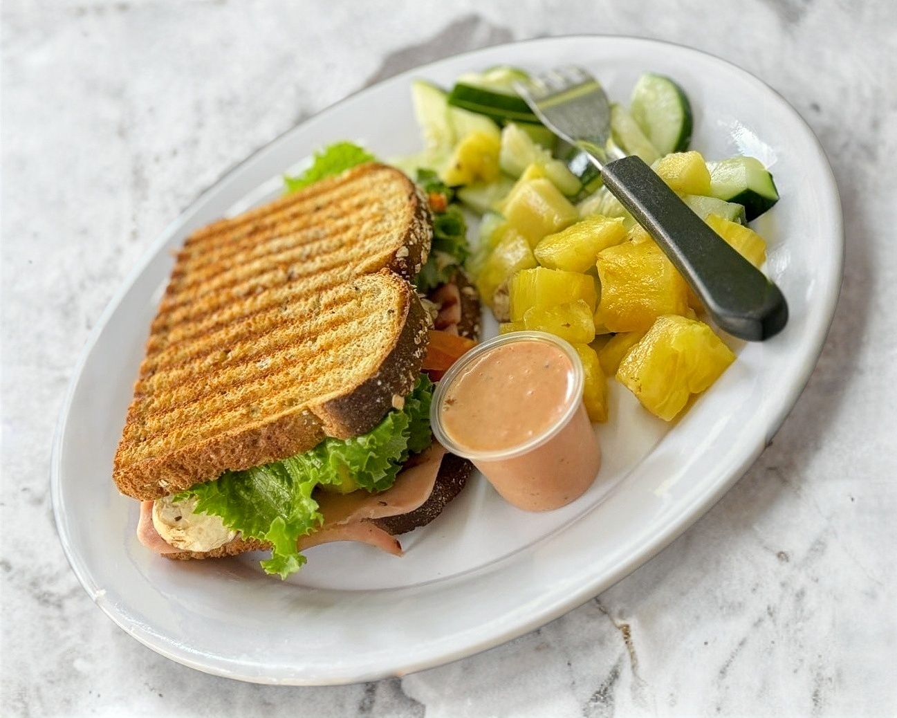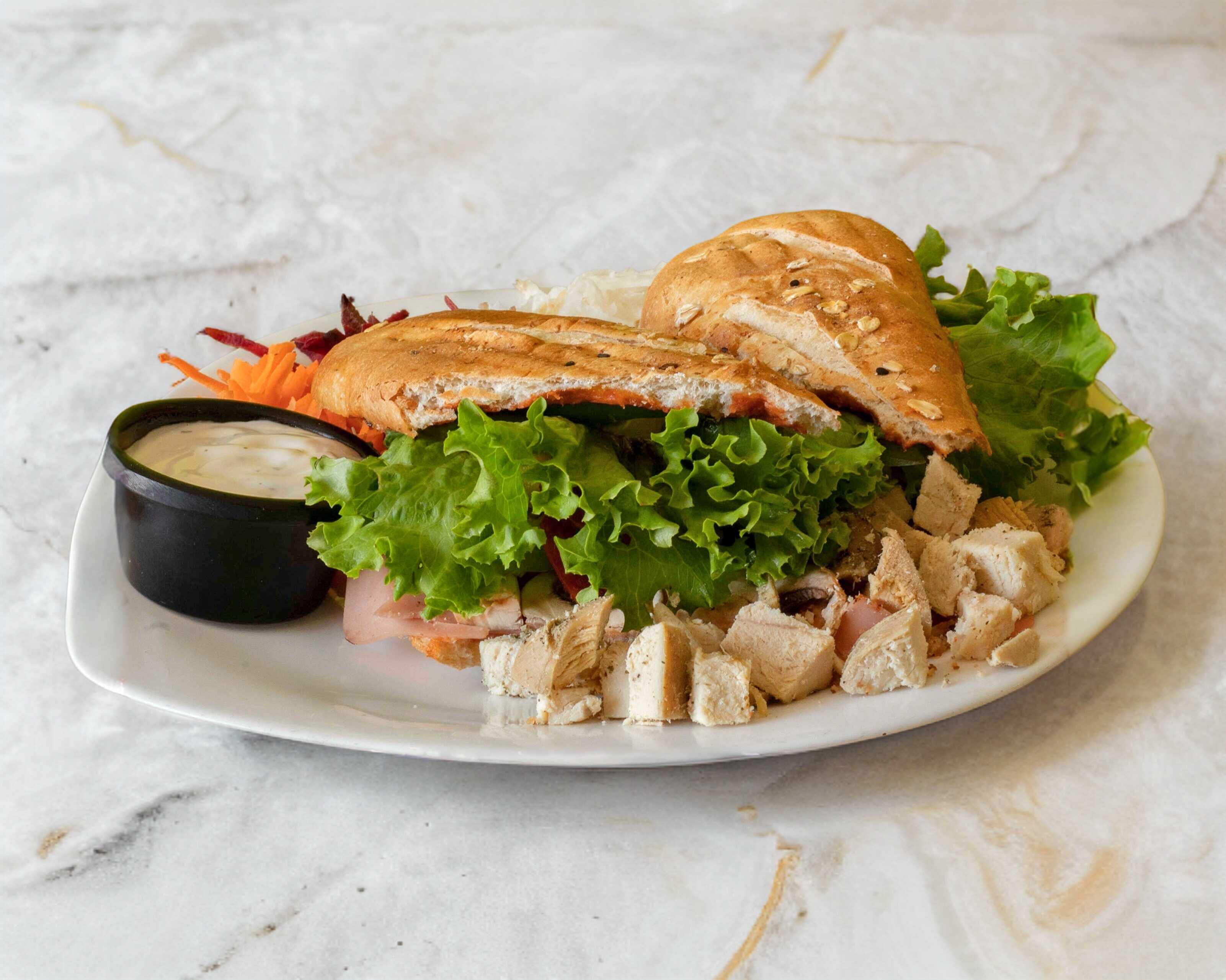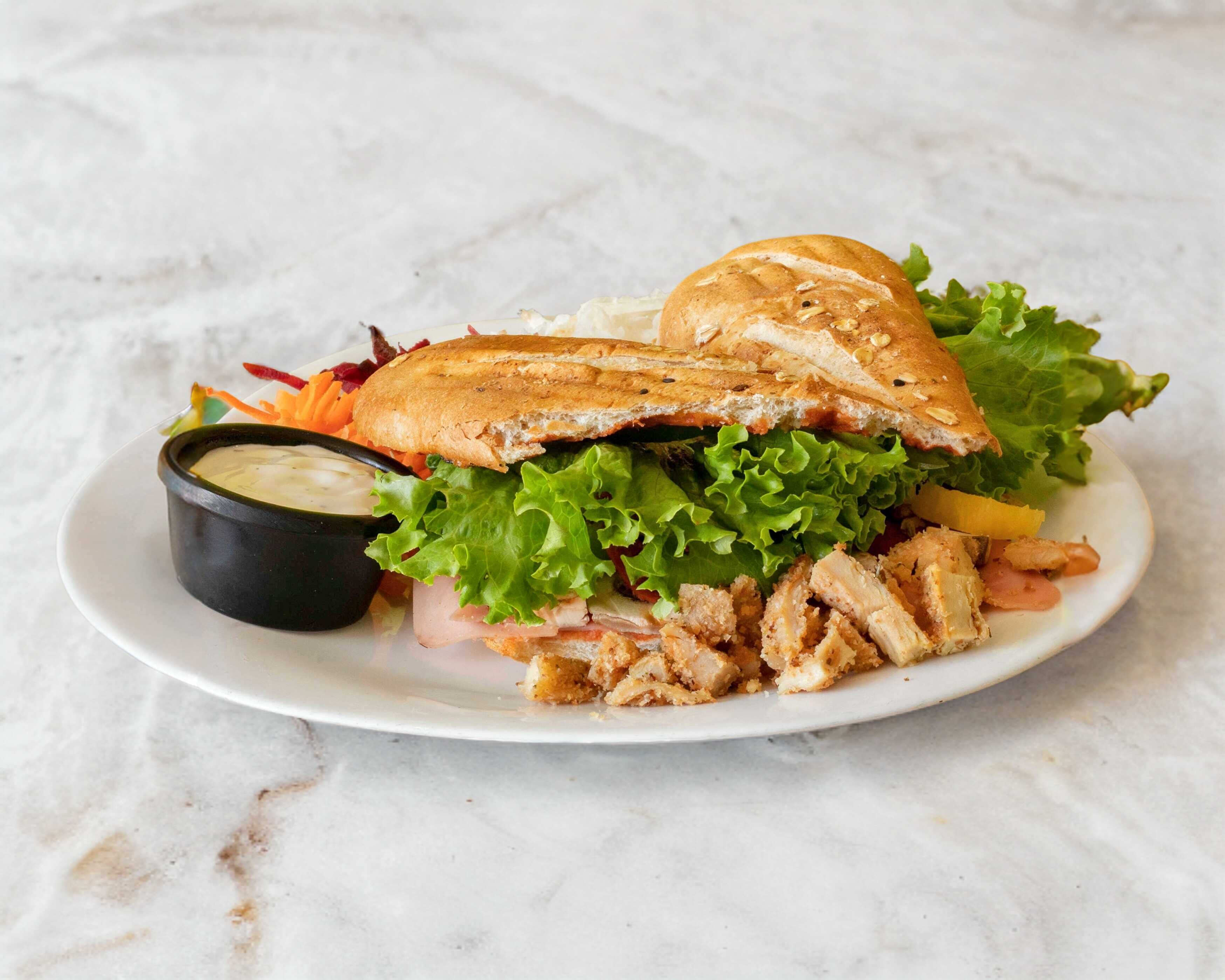 Jamón de pechuga de pavo, queso Philadelphia o queso Gouda, jitomate, champiñón, morrón, lechuga y aderezo, acompañados de papas doradas.