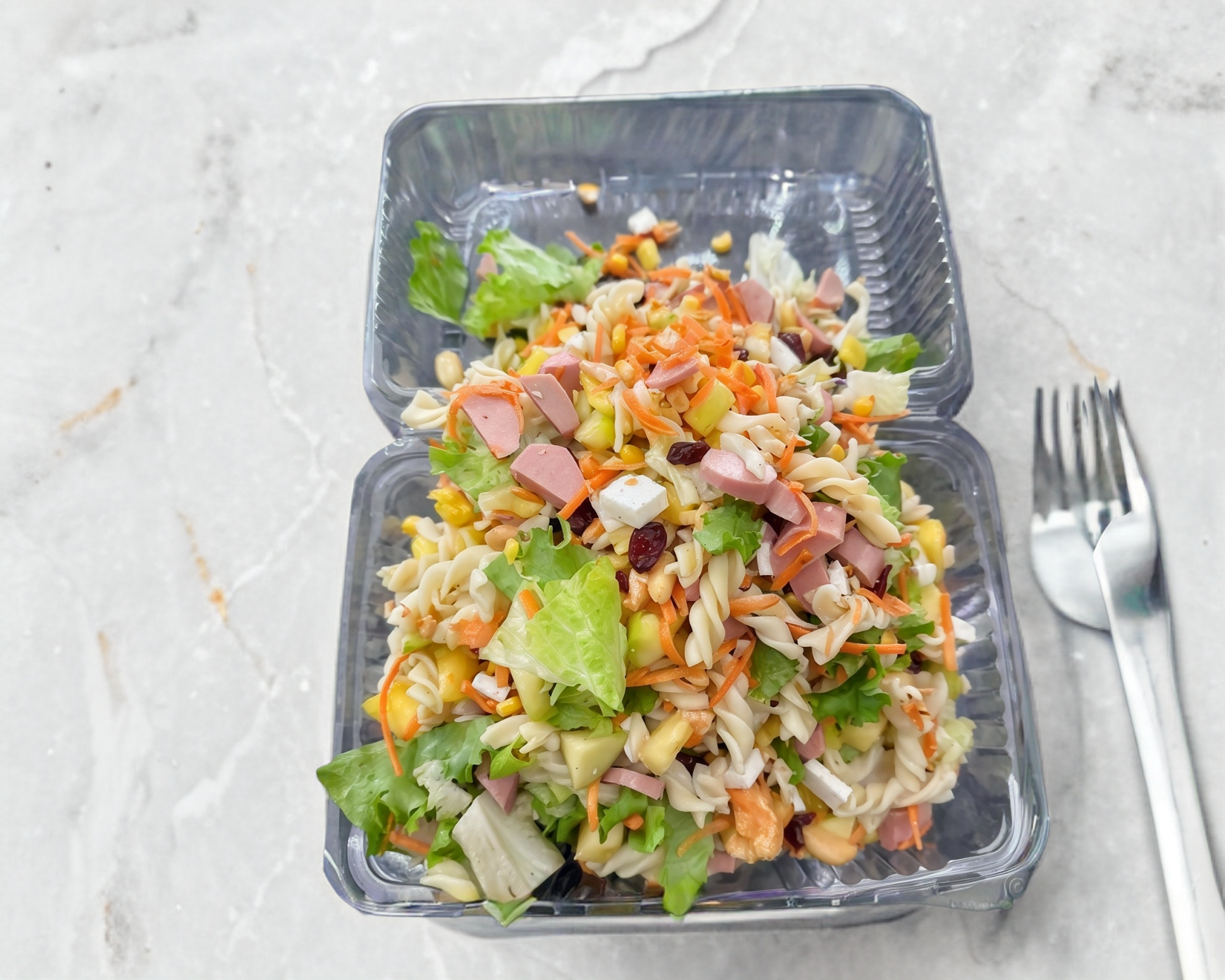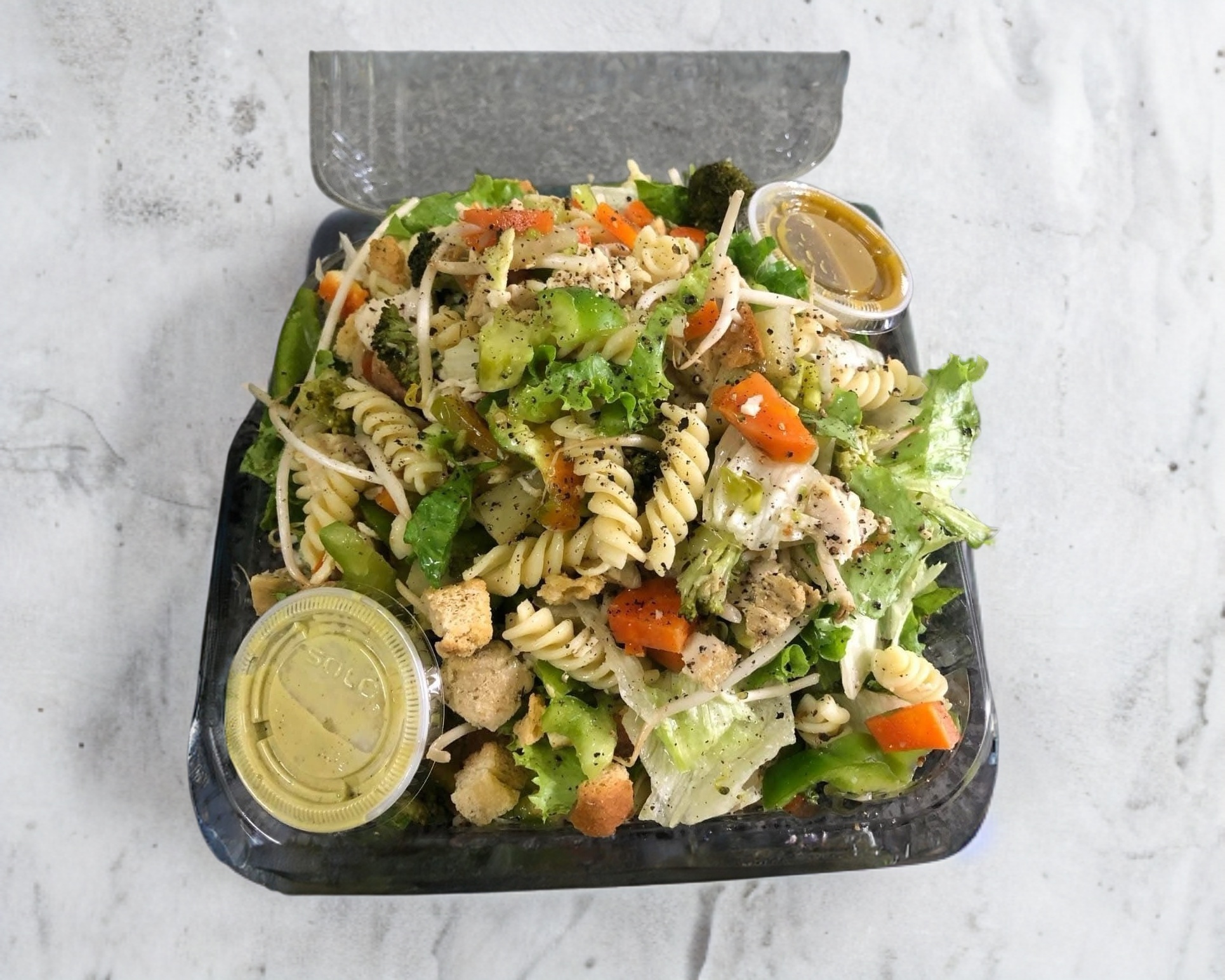 Incluye base de lechuga, aderezo, crotones o pasta, 1 porción de proteína, 3 ingredientes de la barra fría y 1 complemento.