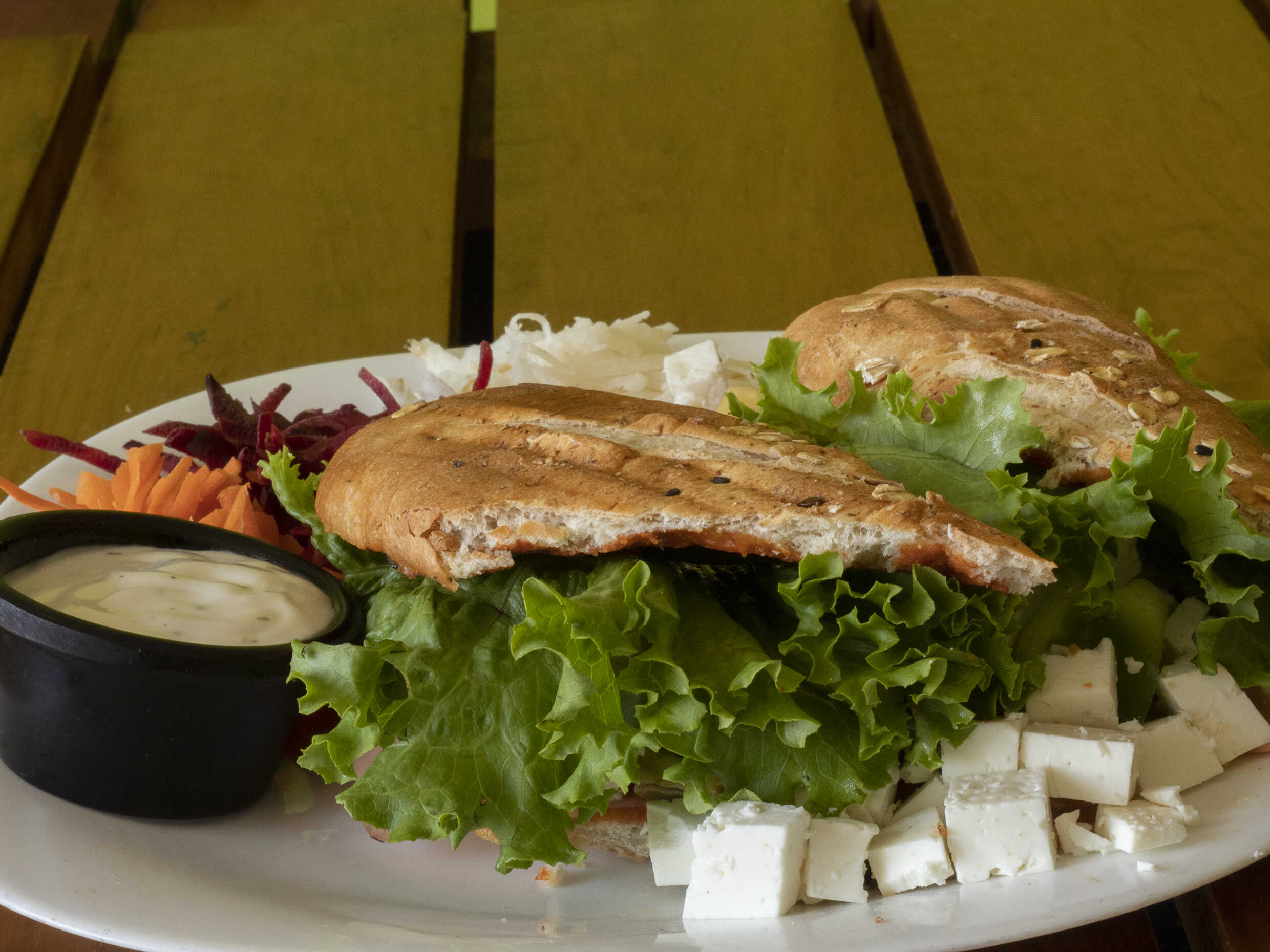 Con queso panela, zanahoria, aceituna negra, espinaca y lechuga.