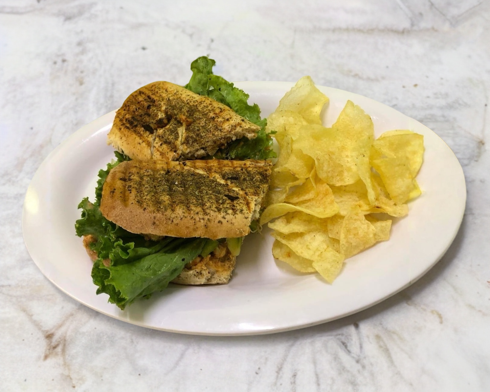 Trocitos de pollo a la plancha, queso Philadelphia, champiñón, morrón, jitomate, lechuga y aderezo, acompañados de papas doradas.