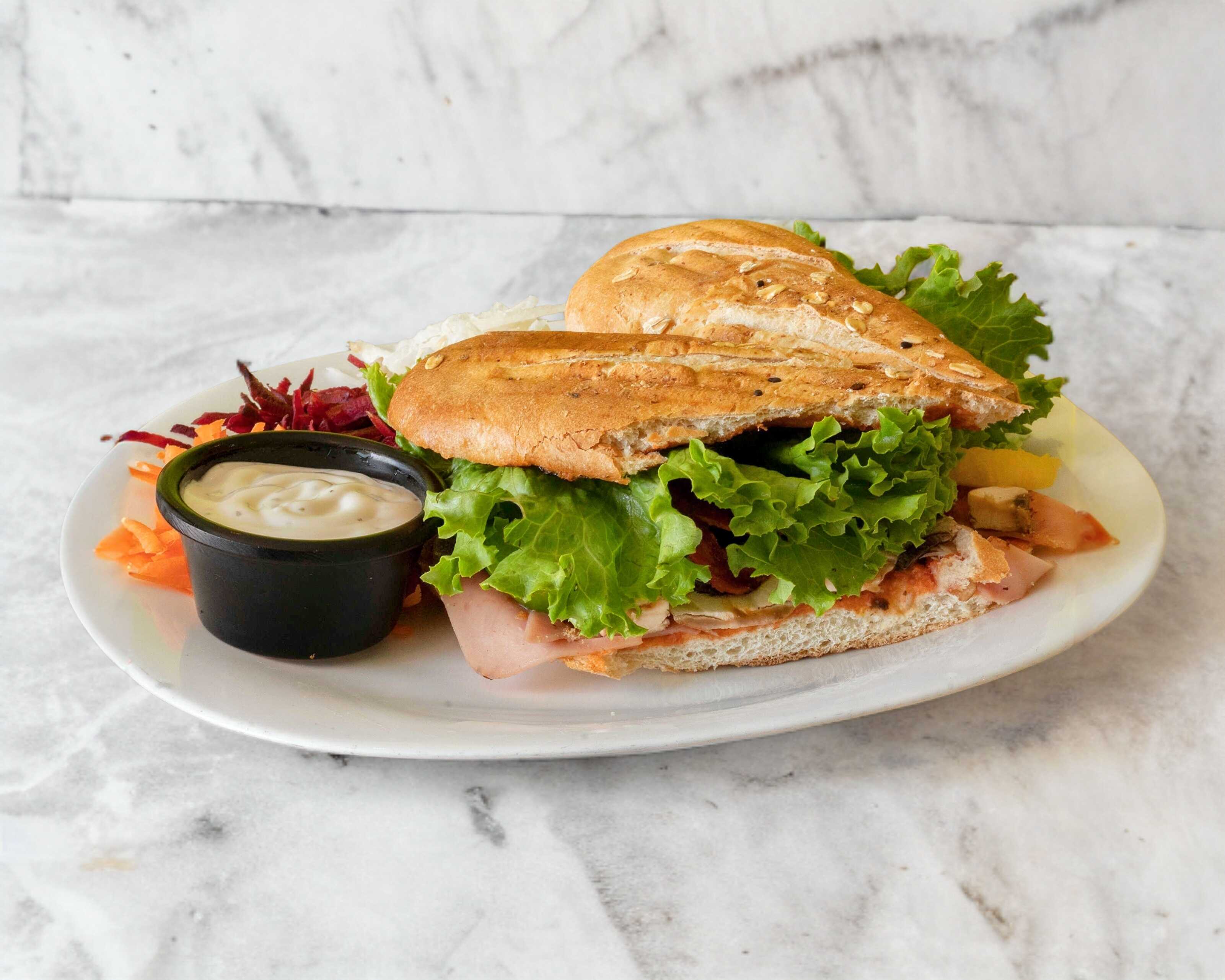 Con jamón de pechuga de pavo, pepperoni, queso Gouda, champiñones, piña, morrón, lechuga y aderezo.