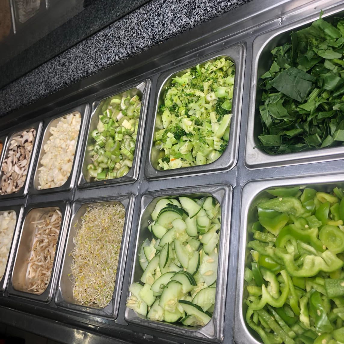 Incluye base lechuga, aderezo a elegir, 2 porciones de proteína, 4 ingredientes de la barra fría y 3 complementos.