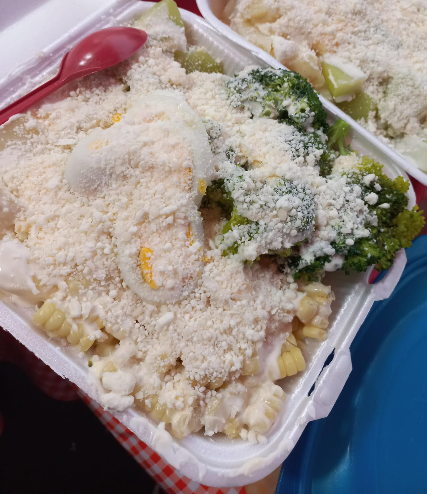 Con crema, mayonesa, cotija, queso amarillos, Cheetos espolvoreados, además chile de aceite, verde, Tajín y de árbol en polvo.