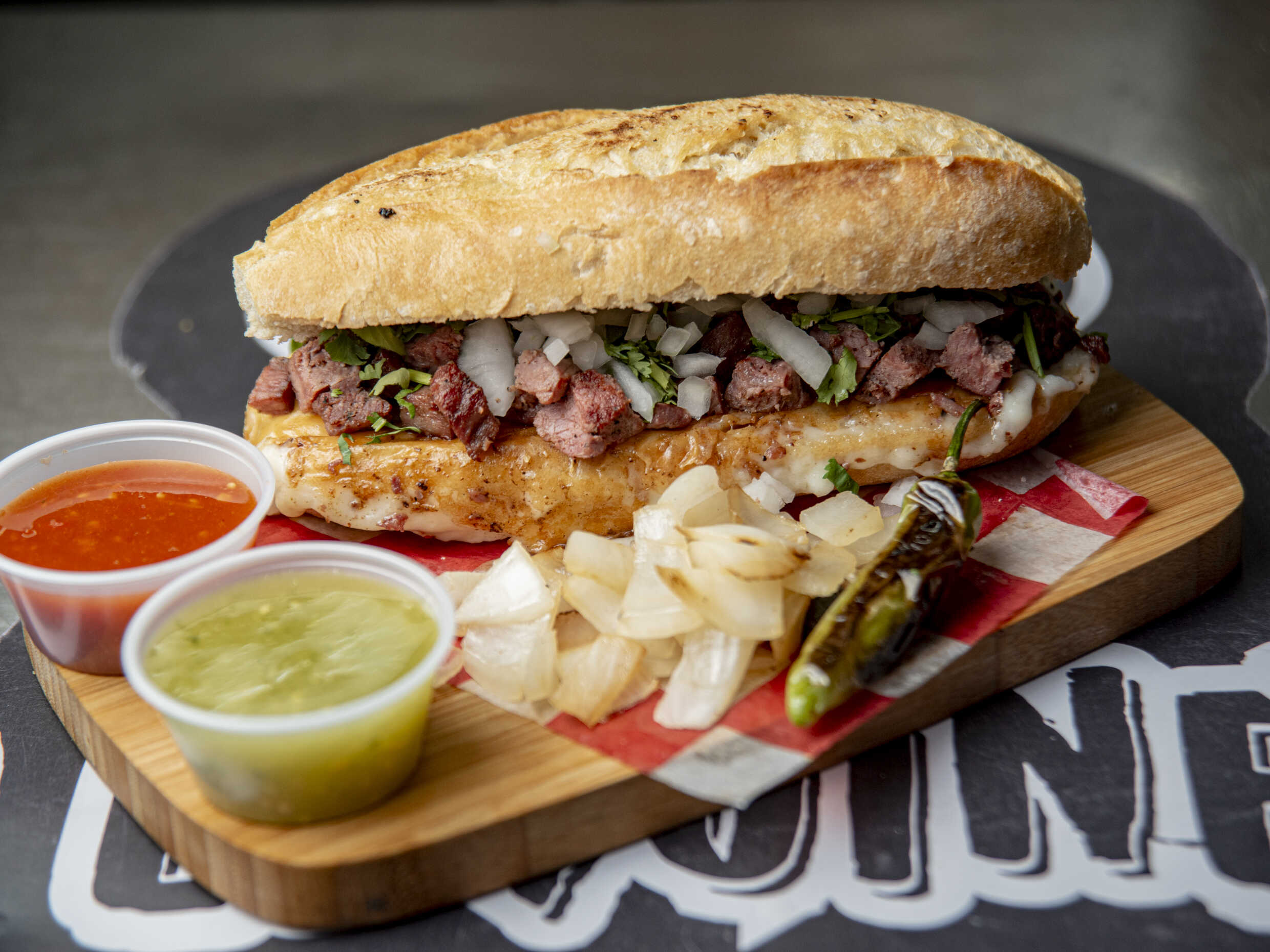 Birote, Acompañado de arrachera, queso gratinado, cebolla y cilantro.